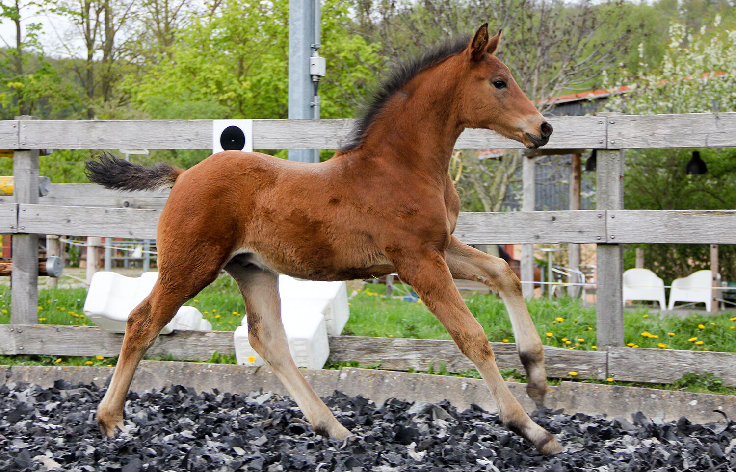 Hannoveransk unghäst efter Segantini x D-Online (De Niro) - Schokolino Santini är en unghingst som redan står i hingststil - smart, självsäker och med en fin överlinje. Han rör sig med mycket energi, lättfotad med mycket driv.