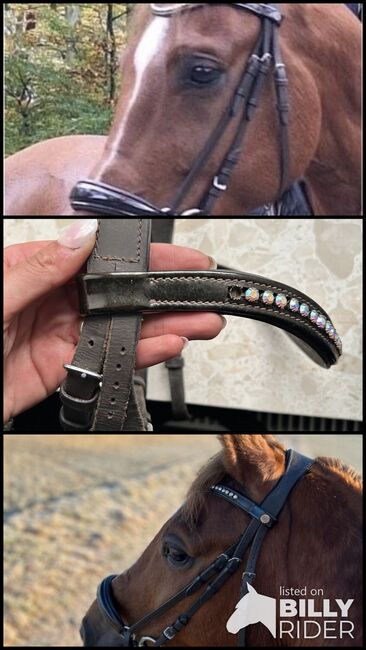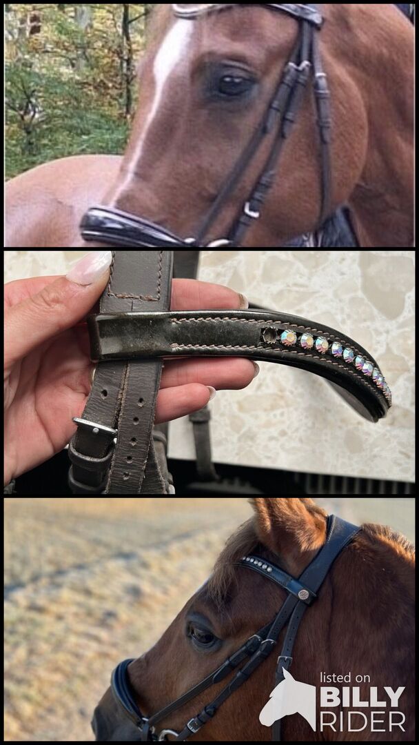 Hannoveranskt träns med lack - Träns med nosgrimma av hannoveransk modell. Nosgrimman och pannbandet är lackerade. En sten saknas från pannbandet, men är knappt märkbar. Utan tyglar.