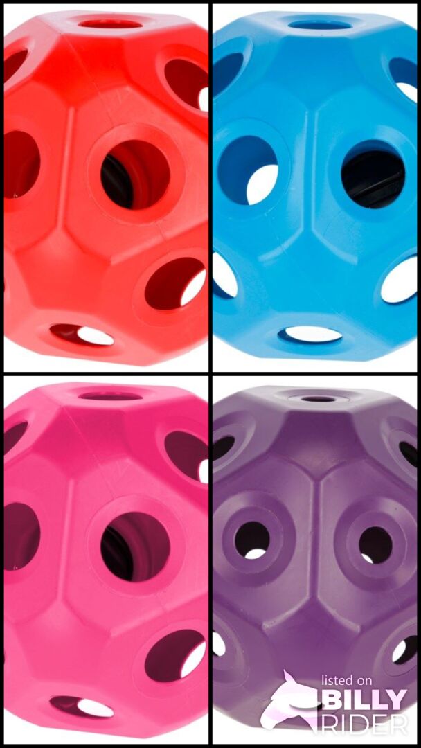 HayBoy Fodder Play Ball - HayBoy mat lekar boll 55,99€ per styck Kulan är idealisk för användning i stallet, på betesmarken eller paddockenmed 19 utfodringsöppningarstark, UV-beständig plastför upp till 3 kg höFyllning via fyllningsöppning 116 mm med skruvkapsel möjligkan också hängas på rep eller kedja Rekommenderade matningsöppningar: