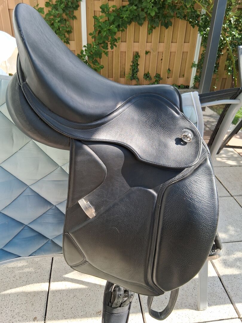 HBS Saddle Dressage 18 tum Toni Flat sadel - I mycket gott skick. HBS sadel Johanna 2, 18 tum sits. Halv djup. Sadeln har det beprövade butterfly-systemet, är rörlig vid axeln, så att sadelns ortpunkter inte klämmer axlarna. Passar på en varmblodig häst med bra bog, kammarbredd ca 34, rak rygg, medelhög manke. Du kan kalljustera sadeln själv med en tång. Liten tår på sadelklaffen, se foto.