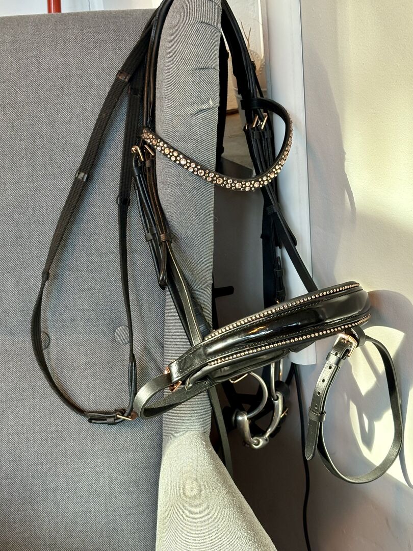 Heinick patent snörning, snörning, turnering, patent, strass, rosé, NY - Superfin Heinick patentträns i svart med strasstenar och spännen i rosé! Storlek Warmblood med mjukt vadderat svenskt nosgrimma! Idealisk för utställning och tävling! Anatomiskt, mjukt vadderat huvudstycke! Var endast på hästen för en fotografering och är därför riktigt NYTT! Tränset säljs inklusive matchande tyglar, men utan bettet!