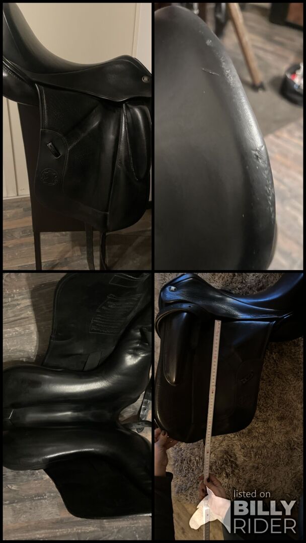 Hennig ASP 17,5 tum - ASP, 17,5 tum, 3/4 knäveck med halvmåne i konstläder. Sadeln har precis blivit kontrollerad av en sadelmakare från Hennig. Skraporna på bilden gjordes under flytten, sadeln har aldrig fallit.