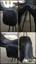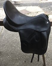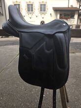 Dressursattel, 17,5 zoll schwarz, 3/4 Pauschen vorne, lange Gurtstrupfen, Soft Sitz, Spezialleder weich doubliert mit Profilbesatz, Verbreiterung mit Stoßabsorbierung und Ausschnitten im Sattelbaum, Ledersattelgut, Sattelschoner