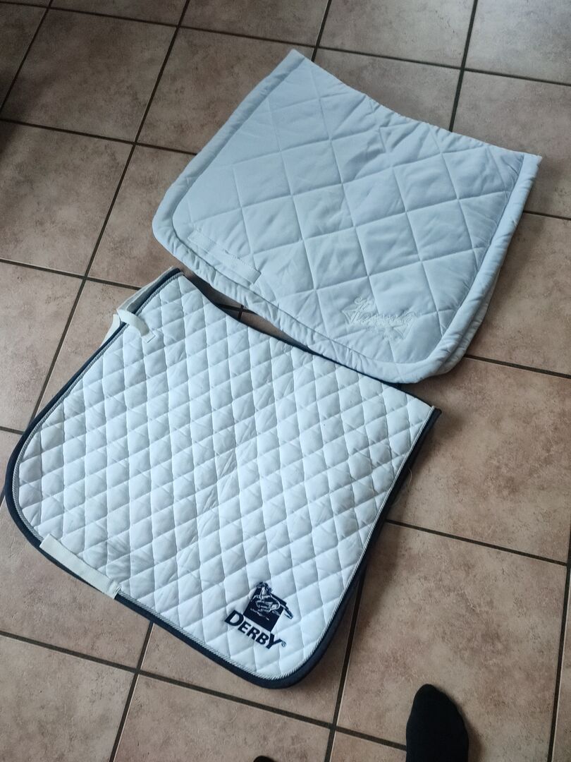 Hennig sadelunderlag vitt, Derby sadelunderlag, Set med 4 bandage från €3 - Hennig Sadelunderlag vit mycket bra skick NP 65€ nu endast 19€ Derby schabraket vitt 6€ Bandage uppsättning av 4 vita 3€ Privat försäljning Jag utesluter allt ansvar för materialfel inget utbyte eller ersättning