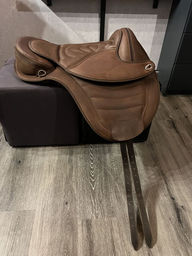 Hero hästsadel trädlös NEWWORTHY liknande Barefoot - Jag säljer en trädlös sadel från Hero Reitsport i nyskick. Den liknar Barefoot Cheyenne-modellen. Sadeln användes endast 3 gånger på hästen i ca 45 minuter varje gång. Jag hade använt den som övergångssadel, men eftersom jag nu äger en lämplig engelsk och westernsadel behöver jag den inte längre och den är definitivt för bra för att ha liggande. Materialet är äkta kohud och har precis rengjorts och vårdats. Observera att sadeln ännu inte har satt sig och därför ser väldigt bred och hög ut på hästen i början. Detta kommer dock att lösa sig med tiden. Stigbyglar kan naturligtvis användas på sadeln, fjädern är stängd. Gaffeln kan också bytas ut, de klassiska från Barefoot ska passa (ingen garanti!) och sättas in genom dragkedjan. Detta är endast ensidigt, dvs. ingen dubbel glidning. Jag använde sadeln på en bred Friesian och Noriker. Därför helt perfekt för de bredare hästarna.