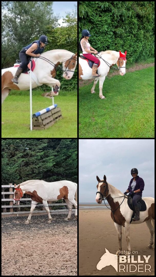 17;2 skewbald Duchess is very laid back but will step up a gear if asked, she has done fun rides farm rides beach rides, has competed in hunter trial , used for hacking and pleasure only my choice but would be great at other things too, she is only for sale as ido not have time and she is too good a horse to waste in the field, she has been ridden by all ages and always looks after her rider , she stands around 17:2 but a big arm chair ride, lives out mostly but enjoys a night in , very well behaved for farrier, vet etc. loads on lorry trailer or box as she has travelled in all , shod on all 4s but has also gone barefoot on hinds . Will be sold with tack and a rug , perfect mother daughter share also