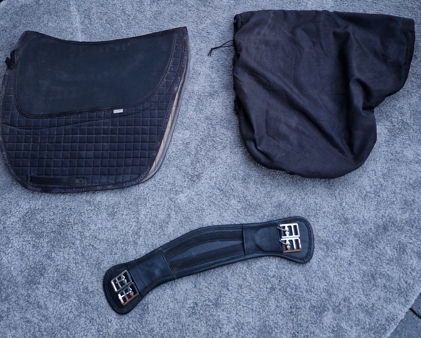 Tillsammans med sadeln ingår ett par silverbarocka stigbyglar, Bates Webber stigbyglar, Grandeur pad Valencia med filt och mossgummiinlägg, en ca 55 cm lång lädermåttgrimma i läder (rost är inte till nackdel, bara visuellt) samt en sadelkudde från tillverkaren Hidalgo.
