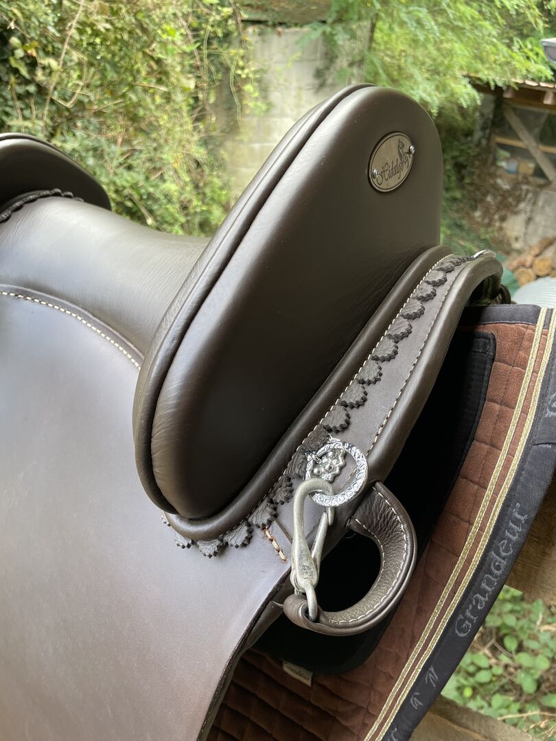 - Köpt ny hösten 2022 - mindre än 10 gånger på hästen - varav ca. 5 gånger riden kort - därför har lädret (panelerna) ännu inte satt sig och är att betrakta som så gott som nytt - Brunt slätt läder med silverbeslag - Storlek 33 (uppskattad till 17,5 tum i annonsen) - paneler 43 cm - original sadelöverdrag ingår - har förvarats oanvänd i ett år på en torr och dammfri plats - sadeln har förvarats försiktigt på en sadelskena för att undvika stress på panelerna