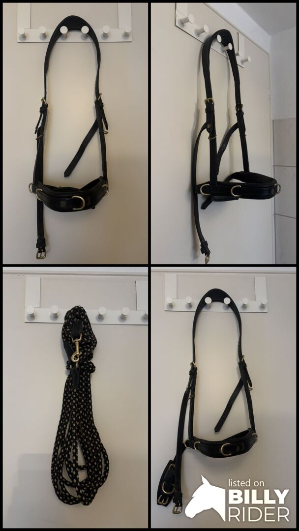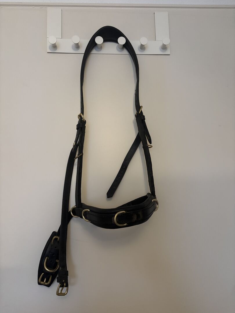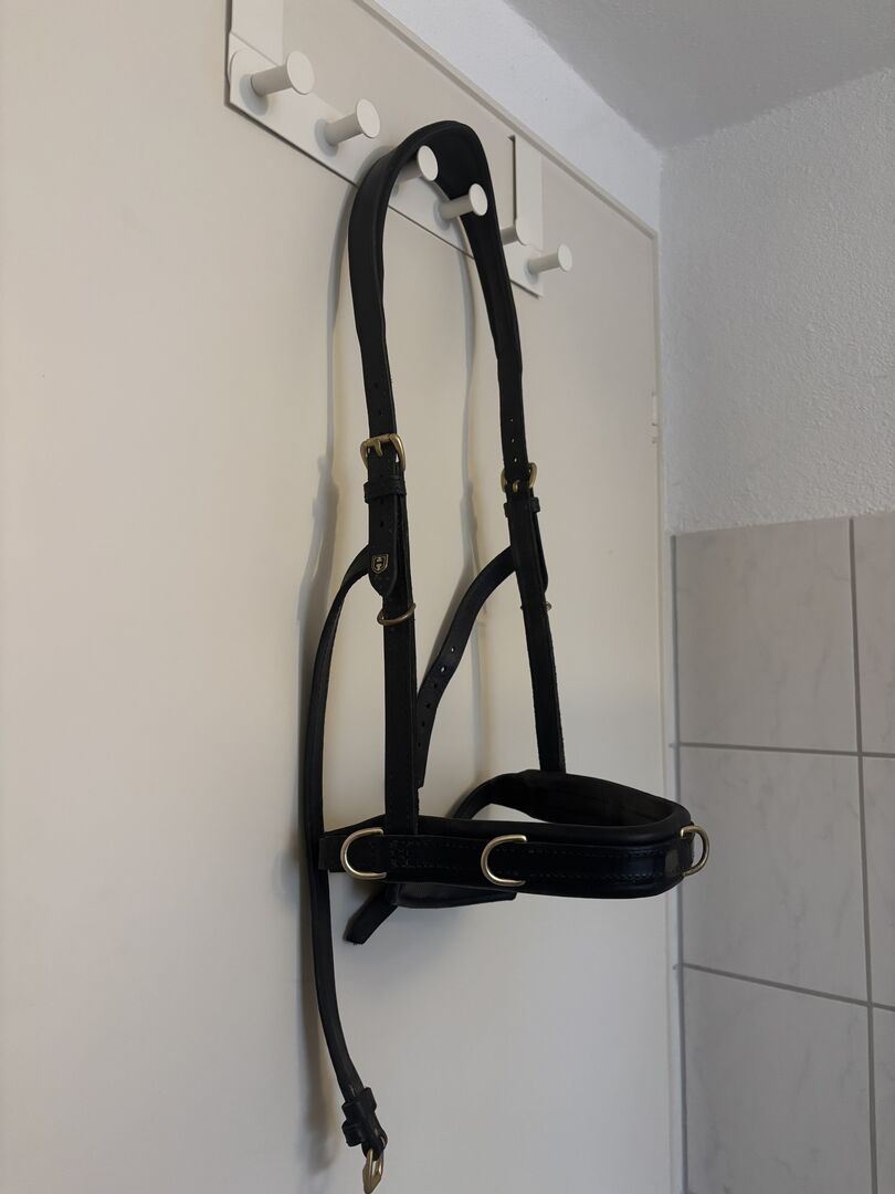 Hillbury Cavesson Varioso svart WB - Jag säljer mitt Hillbury Varioso multifunktionella galoppkapplöpningsskaft i svart, storlek WB, med formbart nosband och guldbeslag.