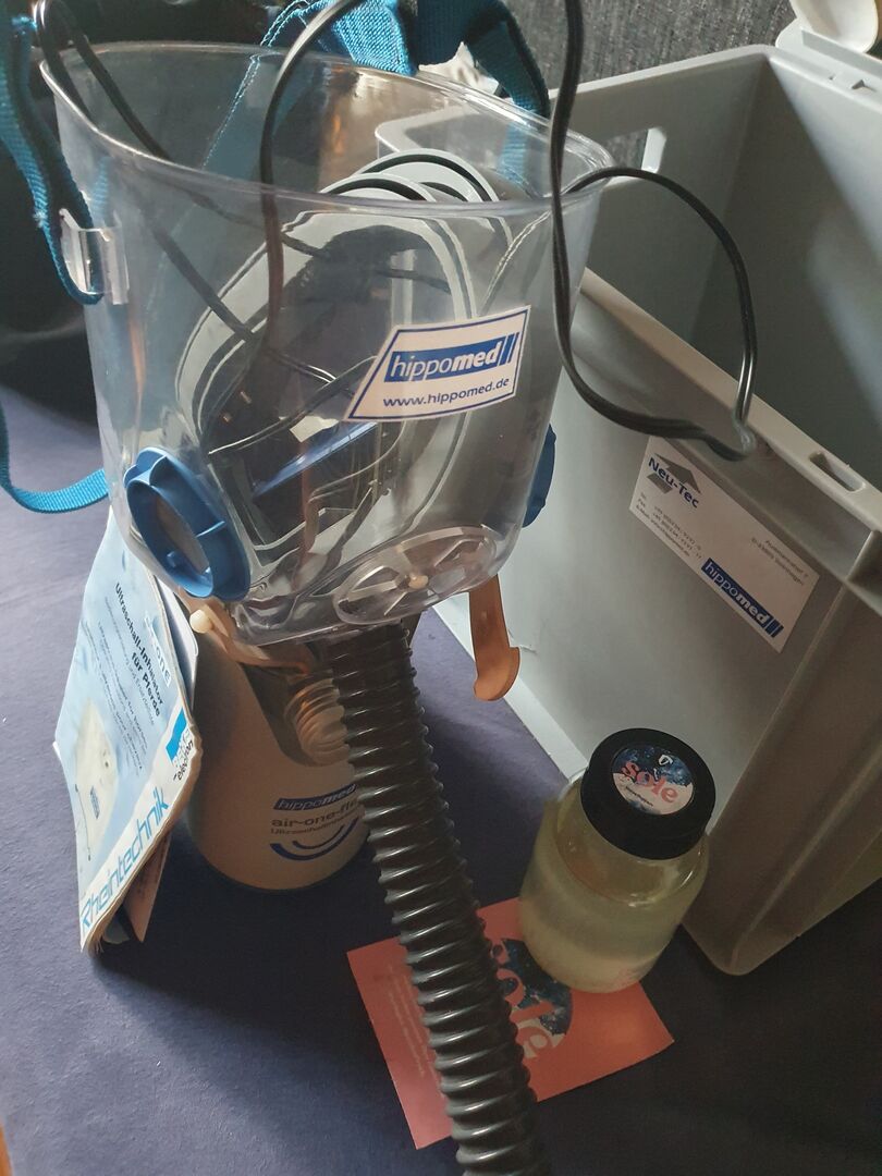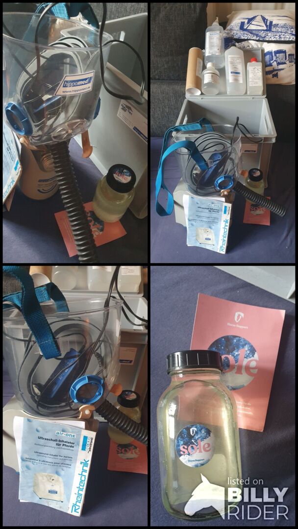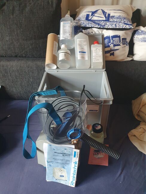 Inhalatorn levereras med 13 koppar, 1/3 kontaktvätska, 1 flaska destillerat vatten, desinfektionsmedel som koncentrat, 1/3 flaska NaCl och högkvalitativ Nordsjösula från Horsesupport.