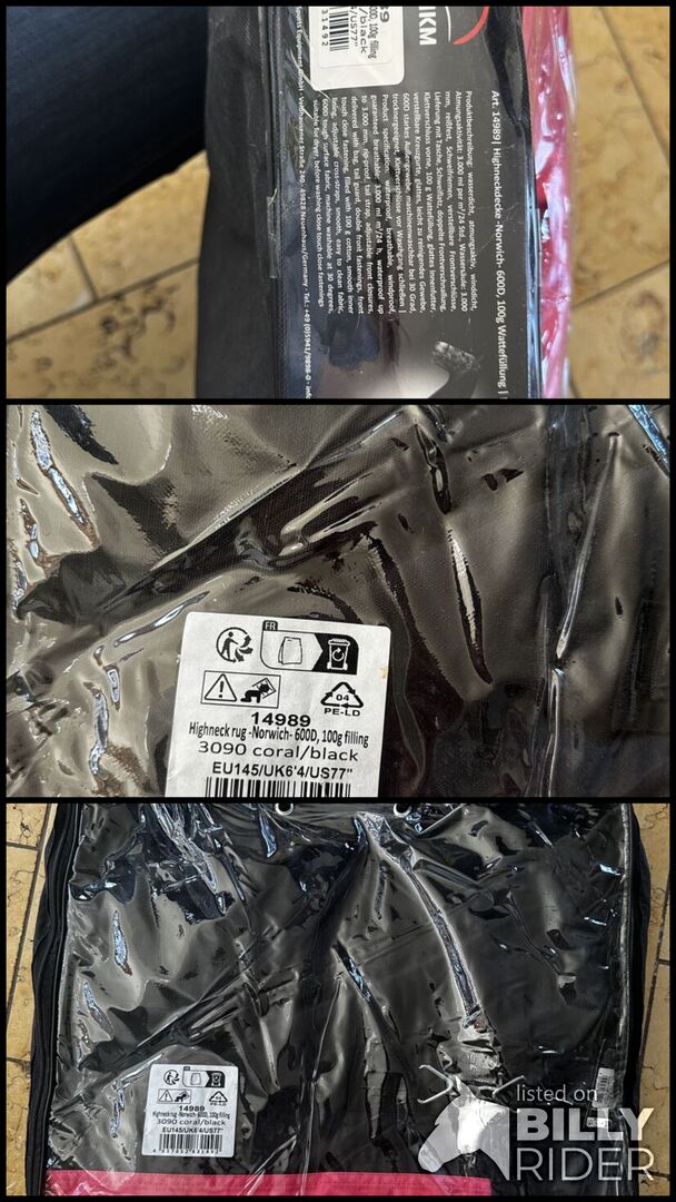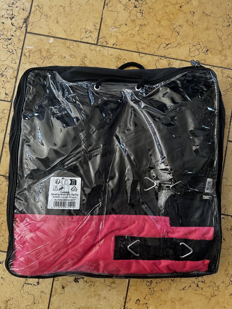 HKM 100g filt rosa 145 - Ny 600D filt med 100g fyllning från hkm. Jag har även filten i Og och den håller riktigt bra. Har en liten hög hals. Färg korall/svart. Köpt för 99.00€.
