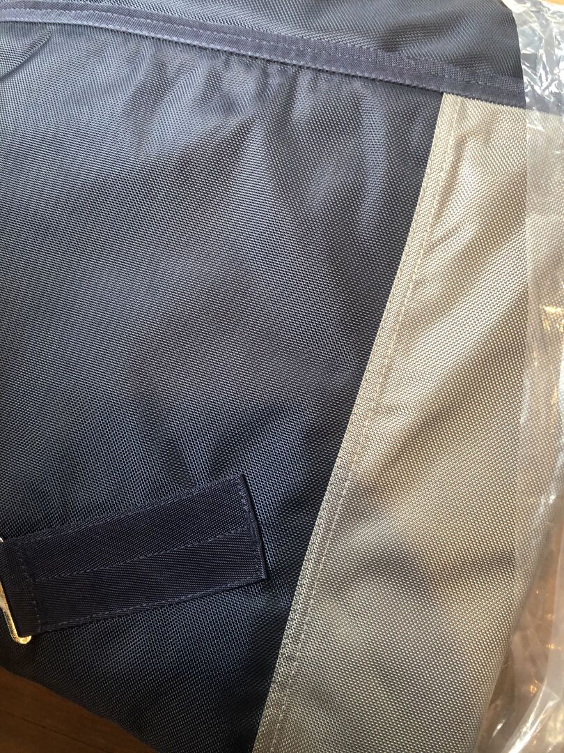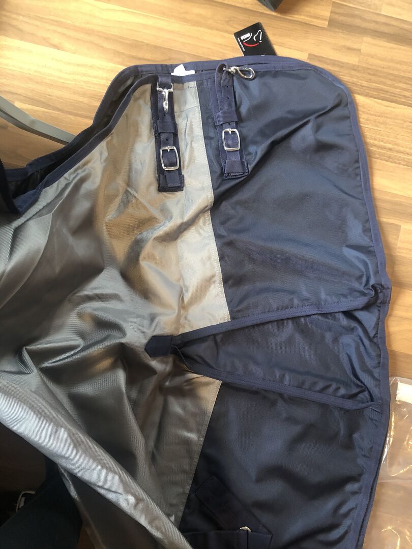 HKM Outdoor Blanket 165cm - HKM utomhusmatta 0g med fleecefoder. Ny, har inte ens suttit på hästen. Med kramar, avtagbara bensnören och generös svanslucka. Storlek 165cm Färg grå/mörkblå