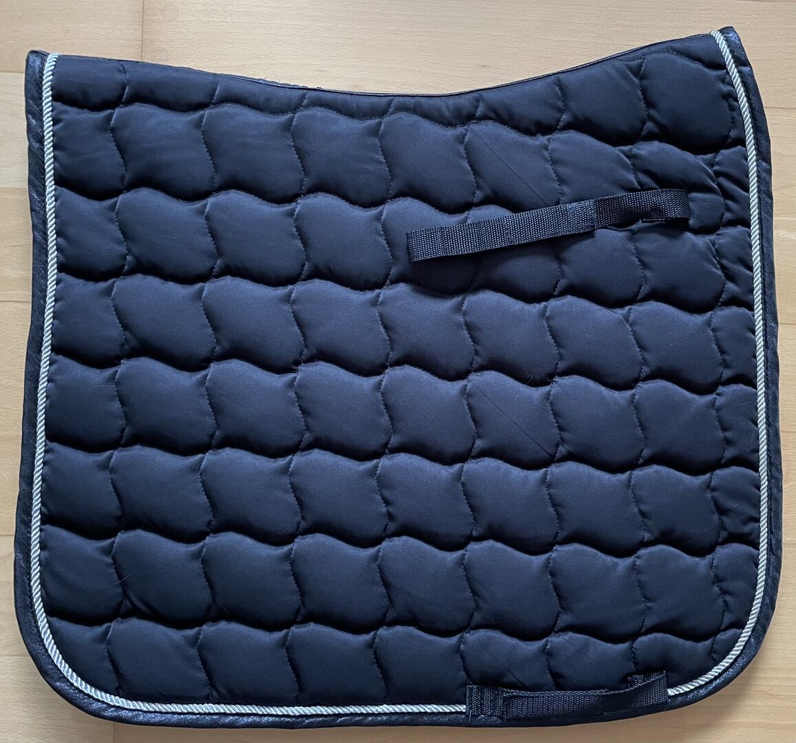 HKM Premium Saddle Pad, Dressage, svart - Säljer ett mycket sällan använt schabraket från HKM Premium, storlek dressyr, färg svart. Stor quiltning, silver bise och svart glittrande kantning. HKM Premium-broderi på virvelkanalen samt på vänster sida av gördelbandets fästanordning.