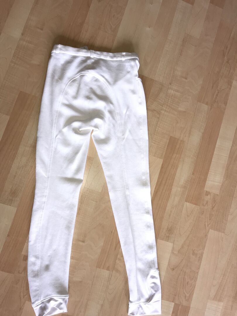 HKM tävlingsbyxor, storlek 176 - De här byxorna med hel sits användes bara två gånger på en utställning och har nu tyvärr blivit för små... De är tillverkade av 95% bomull och 5% elastan. Även om byxorna är vita har de inga fläckar och är i mycket bra till nyskick.