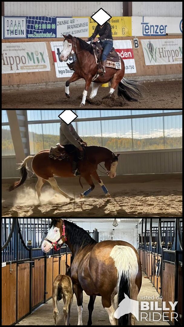 Högkvalitativt Quarter Horse-avelssto med toppstamtavla - Ort: 92266 Tavelsjö/Sverige Gunnerbelle är ett vackert Quarter Horse-sto född 2015 i den speciella färgen Bay Splash (SW1 + SW2) och fångar också ögat med sina två blå ögon. Med en höjd på ca 147 cm har hon en kompakt byggnad och är korrekt och harmonisk i konformation. Genetiskt är hon 5-panel n/n testad. Gunnerbelles karaktär är övertygande längs hela linjen. Hon är mycket snäll, människoorienterad och alltid vänlig och trevlig att hantera. Hennes okomplicerade natur gör henne lätt att hantera och även lämplig för nybörjare. Hon är väluppfostrad och pålitlig under sadeln, särskilt på fältet. Hon är väluppfostrad i den dagliga hanteringen. Hon känner både hovslagaren och veterinären, går på släpvagnen utan problem och är van vid att hållas i flock såväl som i box. Hennes kvalitet som avelssto är särskilt anmärkningsvärd. Gunnerbelle har en förstklassig reiningstamtavla (Colonels Lone Gun x Roseable by Inwhizible) och har redan visat sig vara en utmärkt moder. Hon producerar föl av mycket god kvalitet och för på ett tillförlitligt sätt vidare sina positiva egenskaper så att hennes avkommor utvecklas till fantastiska hästar som är redo att prestera. Hon är för närvarande föl till 2026 efter MS Gunners Cashflow, en homozygot Splash 1-hingst. Gunnerbelle har ridits och har en gedigen reiningutbildning och är helt väluppfostrad i fält. Hon säljs dock som avelssto. Hon är en riktig pärla för avel och ett värdefullt tillskott till alla avelsdjur.