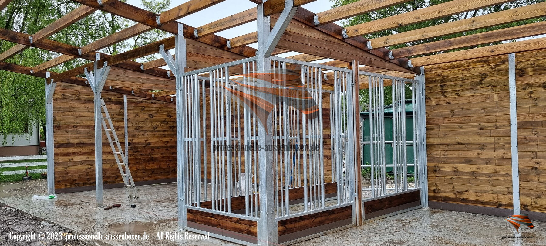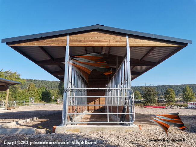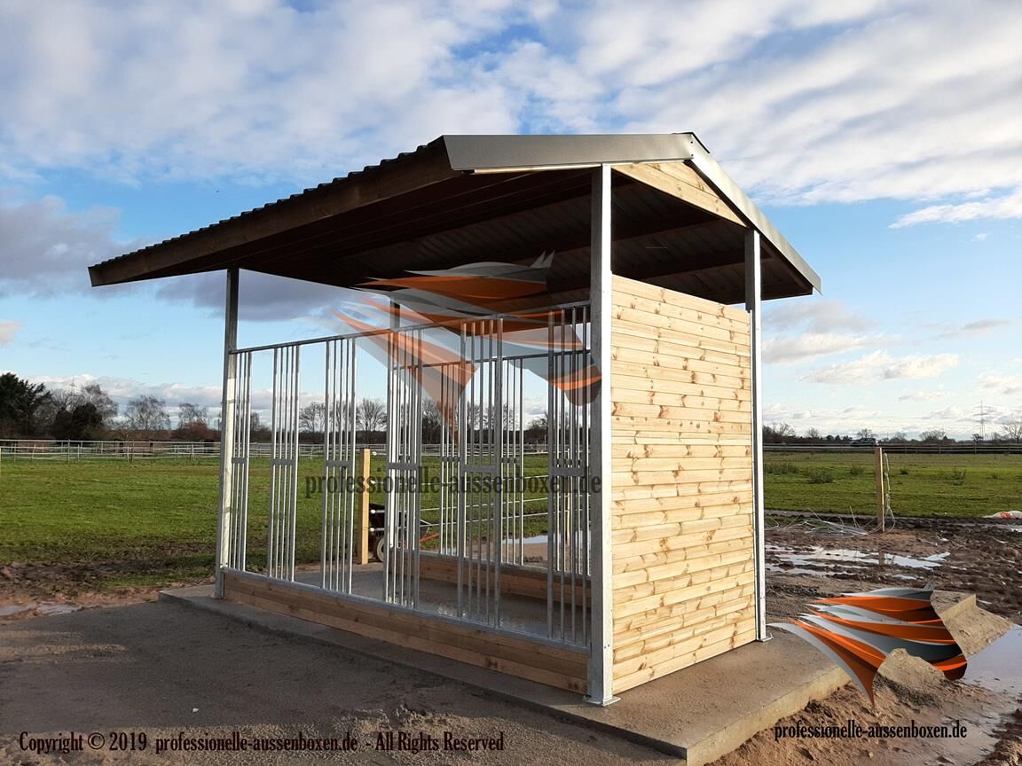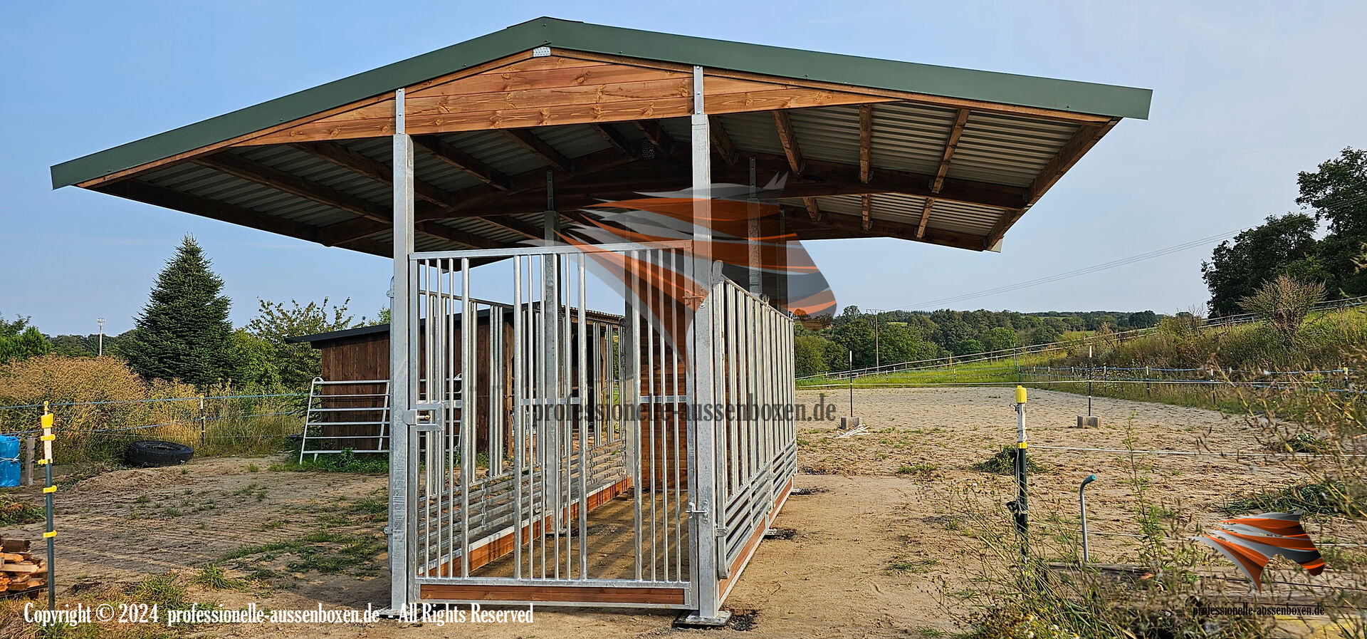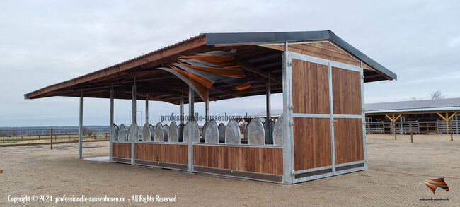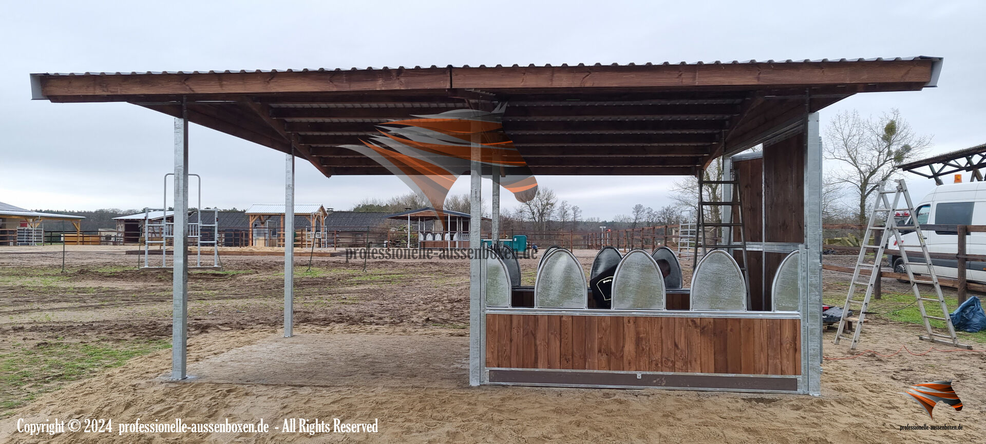 Professionella utomhusboxar erbjuder högkvalitativa höhäckar för hästar, idealiska för grupphållning och idealiska förhållanden för att hålla hästar - extremt robusta, snöbelastningstestade och modulärt utbyggbara. För bästa komfort för dina hästar erbjuder vi även skydd med integrerad utfodringsplats - optimalt skyddade från väder, vind och snö.