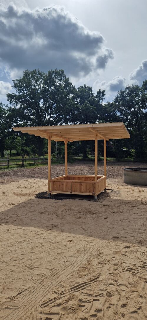 Ställningarna eller foderlådan är förmonterade i min verkstad. Taket monteras sedan av mig på plats vid leverans.