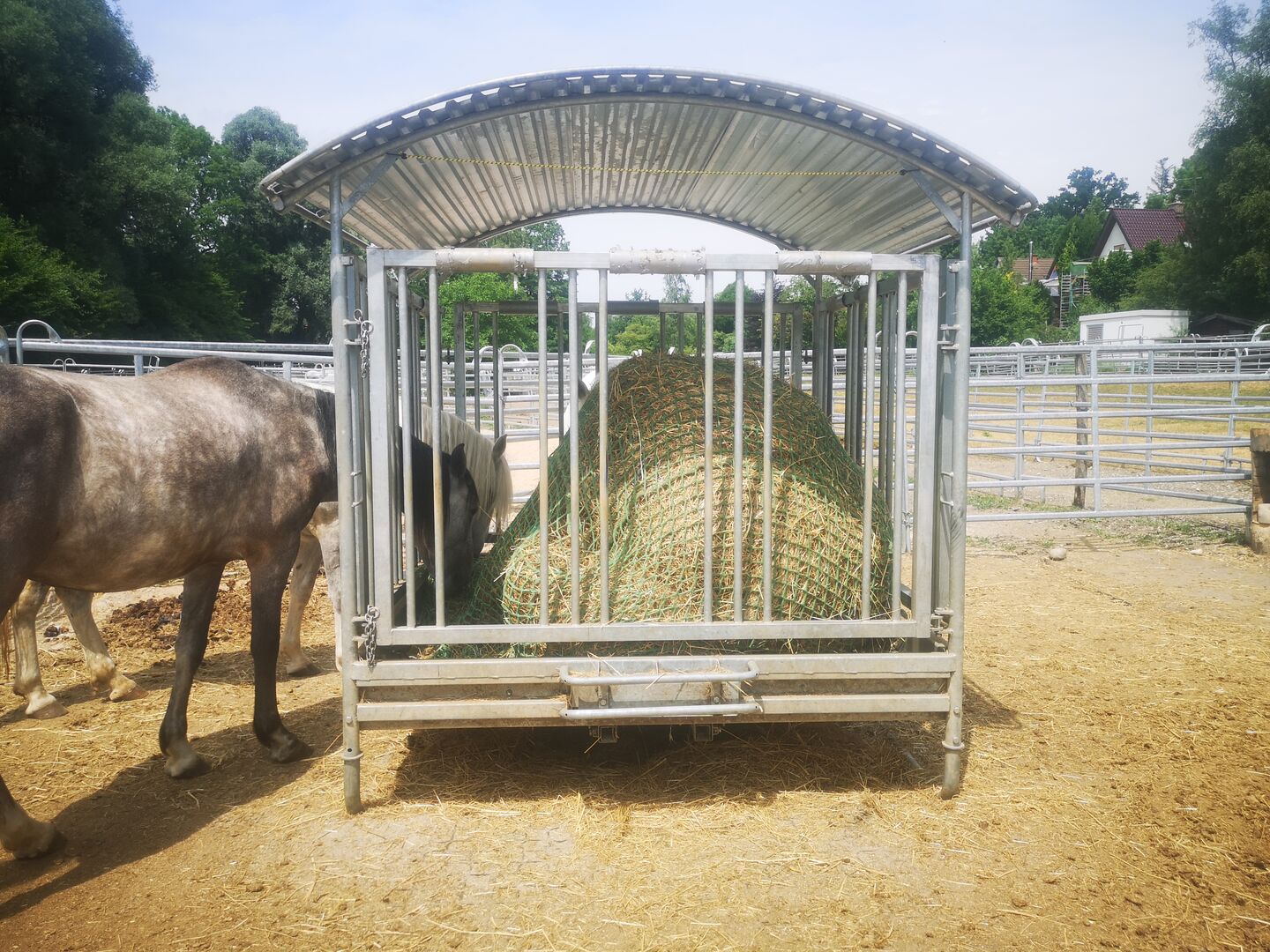 Höhäck metall hästar - Höhäck av metall med tak. 12 utfodringsplatser och 12 extra runda krokar för att hänga upp hönätet utan mellanrum. Nät 3,5 x 3,5 och karbinhake finns tillgängliga för 100 Euro.