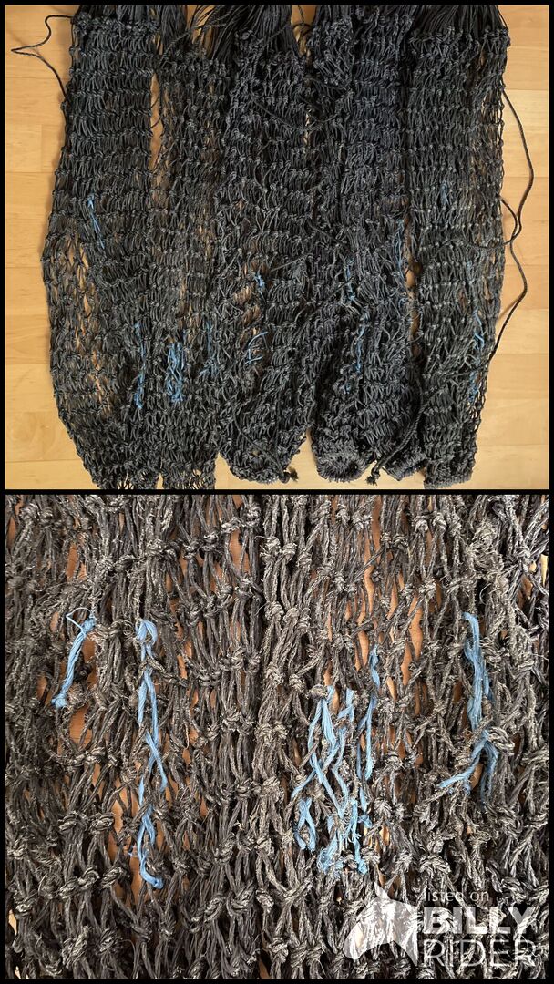 Höjnät, stora, svarta, maskstorlek ca 5x5 cm - Säljer sex begagnade stora hönät, de är svarta eller mörkblå och har en maskstorlek på ca 5x5 cm. Längd ca 110 cm, metallring i botten. De rymmer förmodligen ca 9-11 kg hö. Eftersom näten kommer från olika leverantörer kan det förekomma små variationer i storlek, färg, maskstorlek eller material. Alla nät är tvättade. Det finns sex reparerade nät (se foton), alla nät är fullt fungerande!
