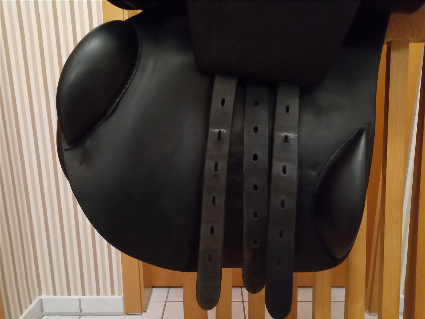 Vissa tecken på användning finns naturligtvis. Euroriding-märket saknas på båda sidor, se bilder. Dessutom är lädret på vänster sida framför bröstplåten något nötta, men jag köpte sadeln som den var och det har inte blivit värre sedan dess.