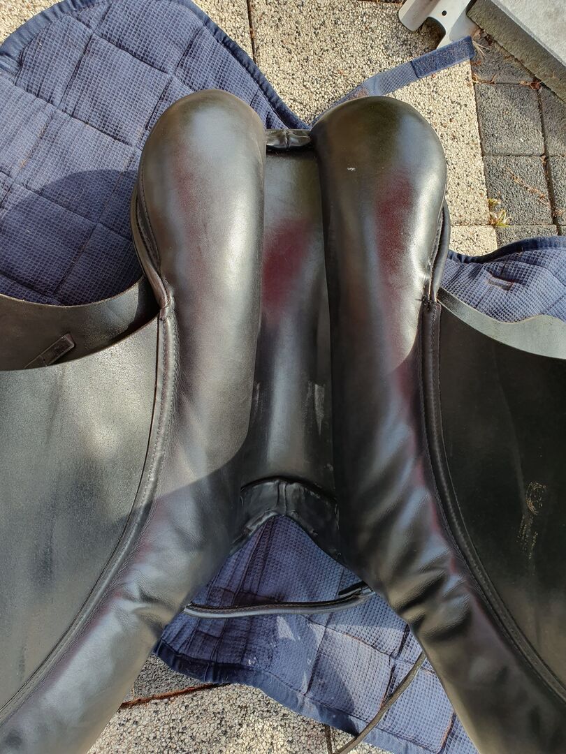 Sadelmakaren sa att sadeln var fin. Den har några ytliga repor, men inga djupa. Vi märkte dock att sömmen vid den främre pommelen, som förbinder sadelns övre och nedre delar, lossnade. och den nedre delen av sadeln. Vi skulle vilja påpeka detta i alla fall. Strips och stigbygel lås är i ordning.