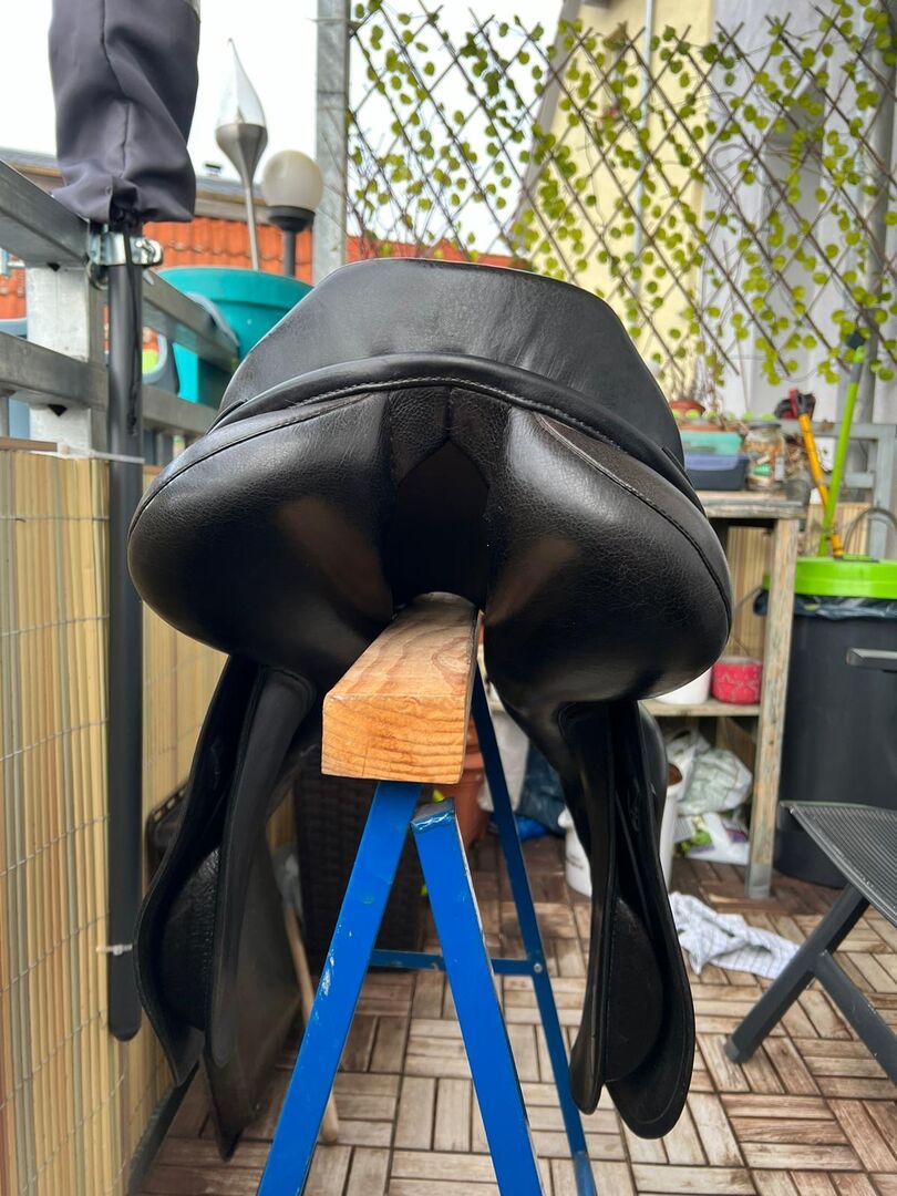 Hoppsadel från AS - Vi erbjuder vår bekväma hoppsadel från märket AS. Sadeln har en kanalbredd på 32 mm och var anpassad för en häst med en uttalad bog. På grund av dräktighet och sjukdom i ryggen passar den inte längre vårt sto. Den är väl omhändertagen och har alltid förvarats torrt. PRIS 1700 €.