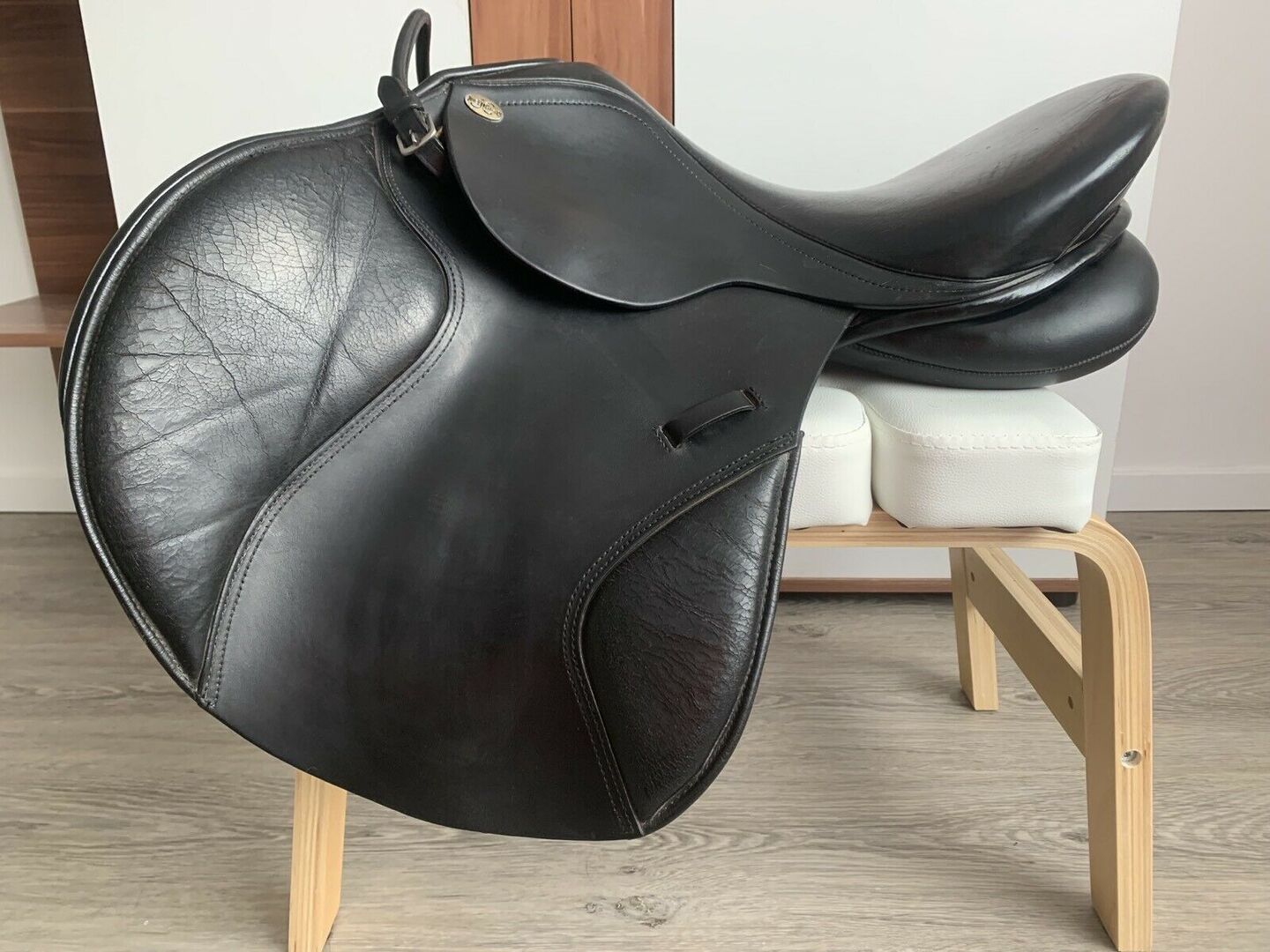 Hoppsadel Jorge Canaves 17,5" - Sadeln är mycket bekväm och ger mycket stöd tack vare de stora pommlarna. Lädret är lite sprucket på sätet och i knä- och vadenområdet, men det märks inte när du åker och det blir inte värre.