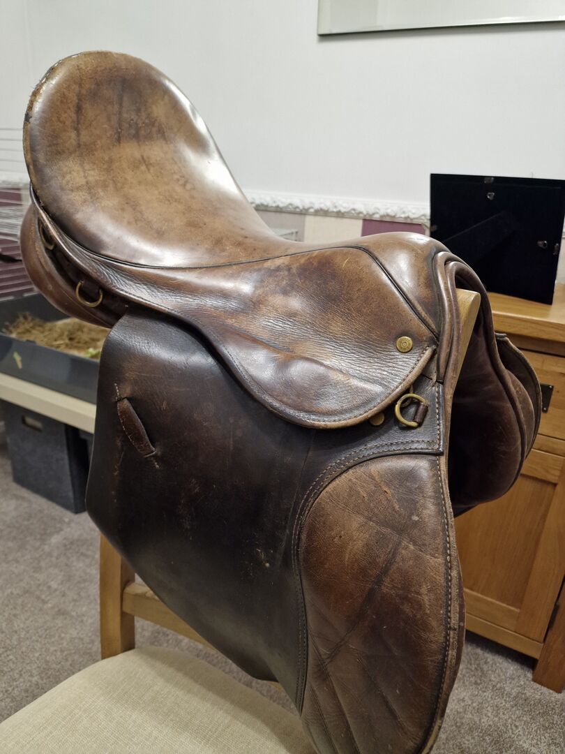 Leather jump saddle, has some markings on the seat and stitching under the seat has come loose, just needs restitching and tightening, this reflects on the price as otherwise this is a very comfortable and well looked after saddle. Can be sold with a fleece lined shires girth for an extra £10 if required. Girth is 46" if wanted.