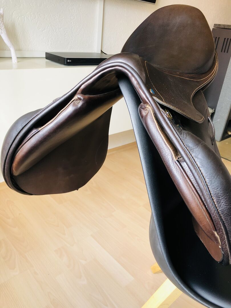 Lädret är dubbat och har ett bra grepp eftersom det alltid har varit välskött. Sadeln har mjuka skumpaneler som passar hästens rygg mycket bra.