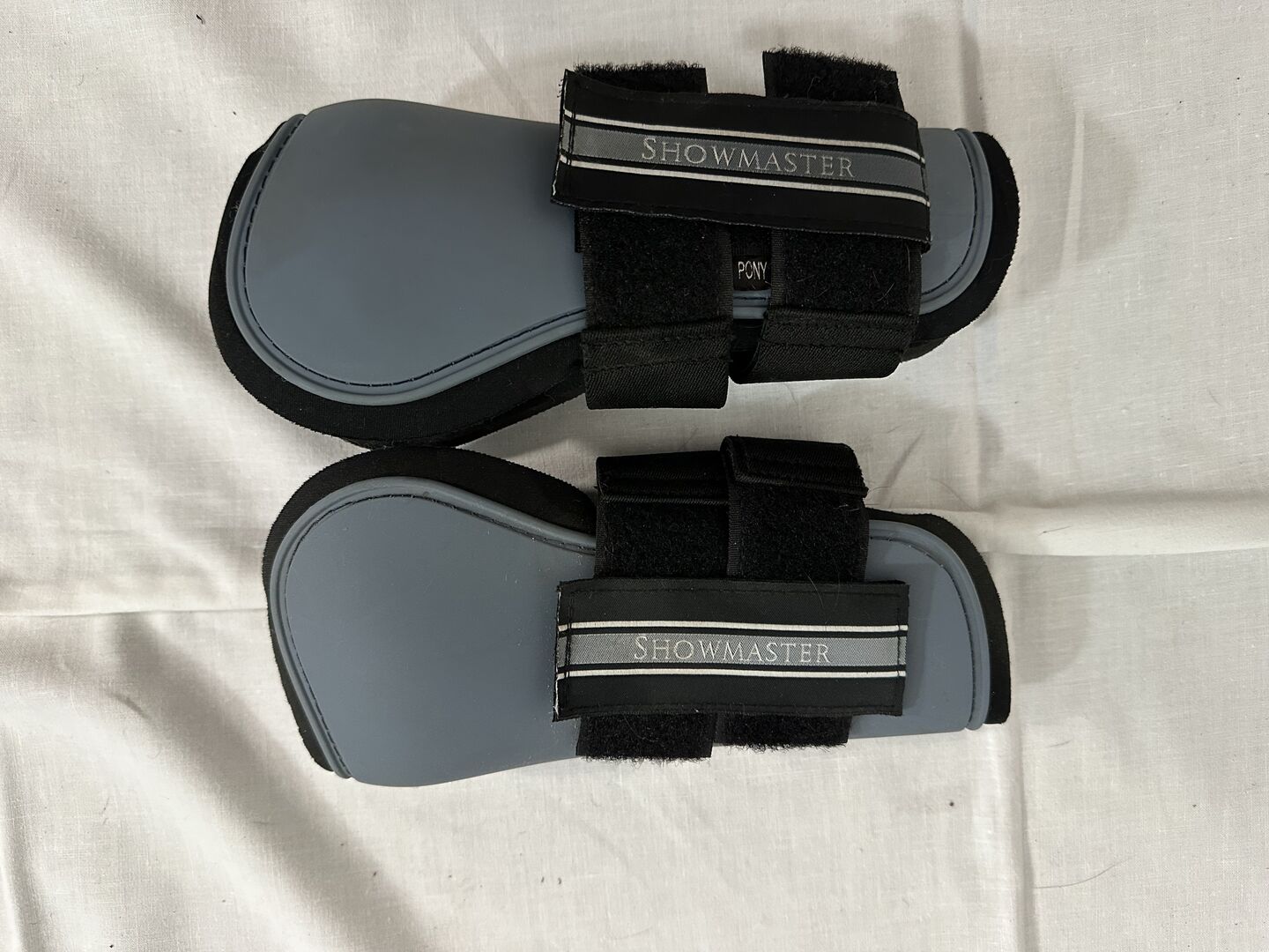 Hoppstövlar storlek ponny ljusblå - Hoppstövlar storlek ponny i en ljusblå färg från Showmaster. Kardborreknäppningen är perfekt. Litet slitage på insidan.