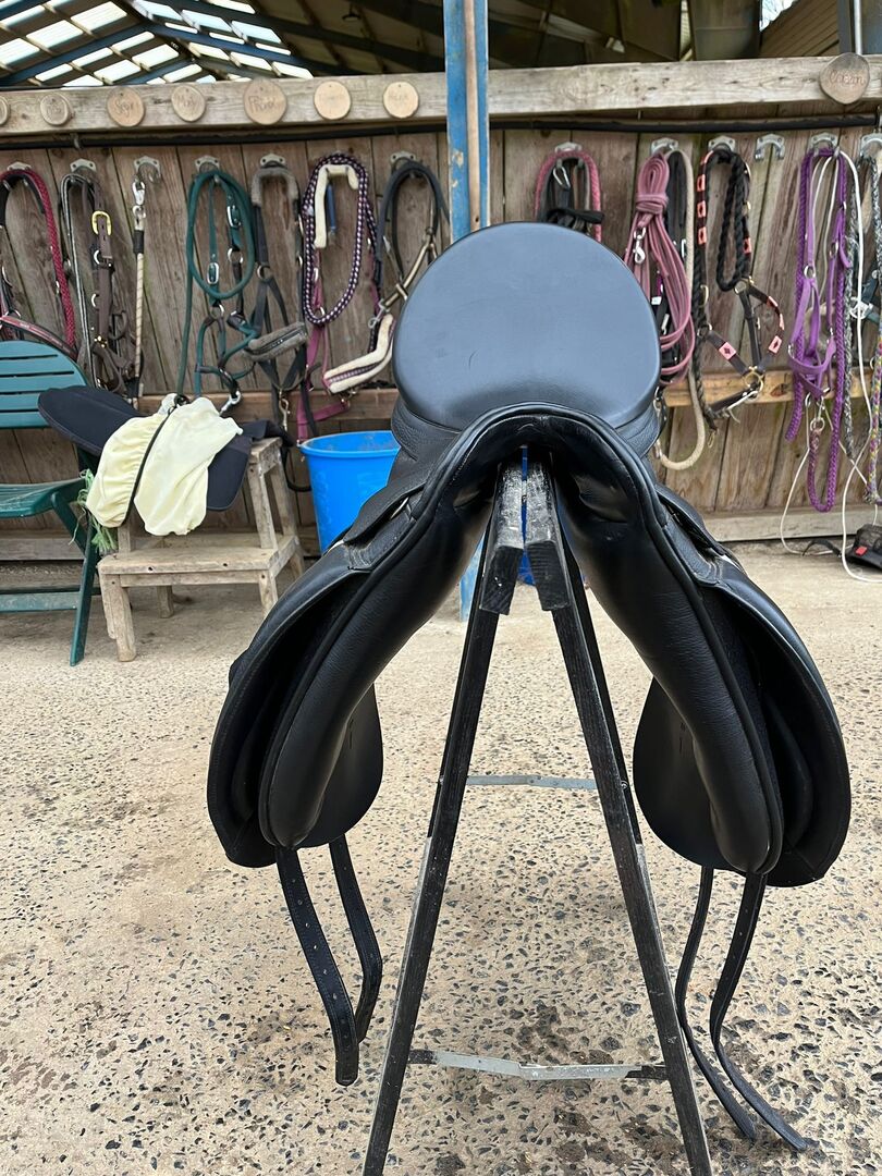 Horse and Passion dressyrsadel - Jag säljer en Horse & Passion dressyrsadel "Passion 2" (dotterbolag till varumärket Kiefer) i mycket gott skick från nov'21 i sitsstorlek 1 (17"). Sadeln är i mycket gott skick och har knappast några synliga tecken på användning. Eftersom vårt unga sto har förändrats mycket under tiden från köpet av sadeln fram till nu, passar den tyvärr inte längre och har därför inte använts mycket. Den har bara vadderats en gång av sadelmakaren och har alltid förvarats torrt. Viktiga data: - Sadelgjord med gaffelplatta - individuellt justerbar genom kallformning - Knäskydd med kardborreband för att ändra position eller för variabelt byte - Med dekorativa sömmar över knävecken - Långa remmar - Syntetiskt läder (därför mycket robust!) -Sadelkudde fylld med ull - Långa sadelgjordsremmar också som nya -PRIS 1.800 EURO Den har tidigare använts på ett litet, smalt varmblodssto (ca 158 cm långt). Bra för hästar med hög manke och lite svank i ryggen. Sadelklaffar och stigläder ingår :) Fler bilder på begäran. Matchande Winderen dressyrdynor är också till salu.