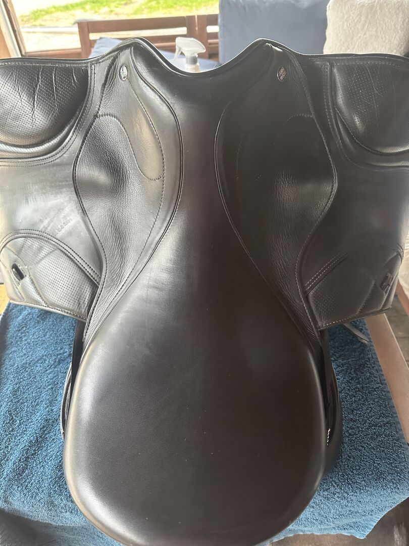 Skålbredden är individuellt justerbar och skålplattssystemet kan justeras. Sadeln är utrustad med ett V-sadelgjordssystem och en smal, utbytbar panel för bra kontakt med hästen. Knärullarna kan också justeras.