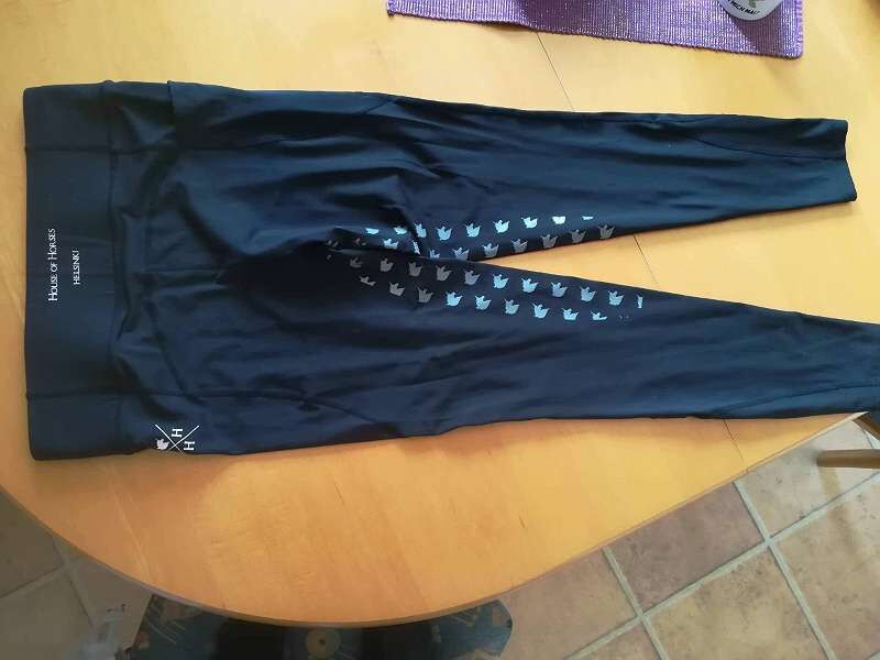 House of Horses ridning Leggings - Högt skurna svarta ridleggings med enhörningsgrepp, ger en bra figur även med feminina kurvor och är bekväma att bära. Med en ficka för mobiltelefon. Greppet är missfärgat svart på några ställen (se bild), i övrigt gott skick!