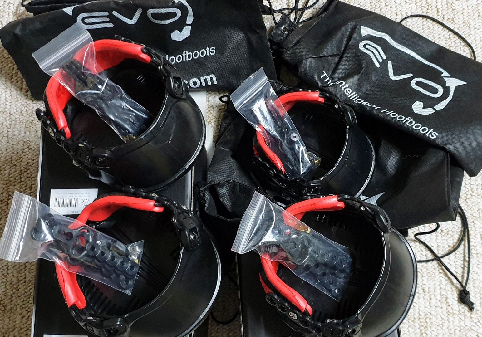 Hovskor EVO, 1 par, NYA - Helt nya par EVO hovskor i originalförpackning med väska, instruktioner och reservmaterial. Säljs på grund av förlust av häst, skorna har inte provats på (var avsedda som ett reservpar). Pris för upphämtning, för frakt inom CH plus 10,00 CHF för porto och förpackning. Twint-betalning möjlig.