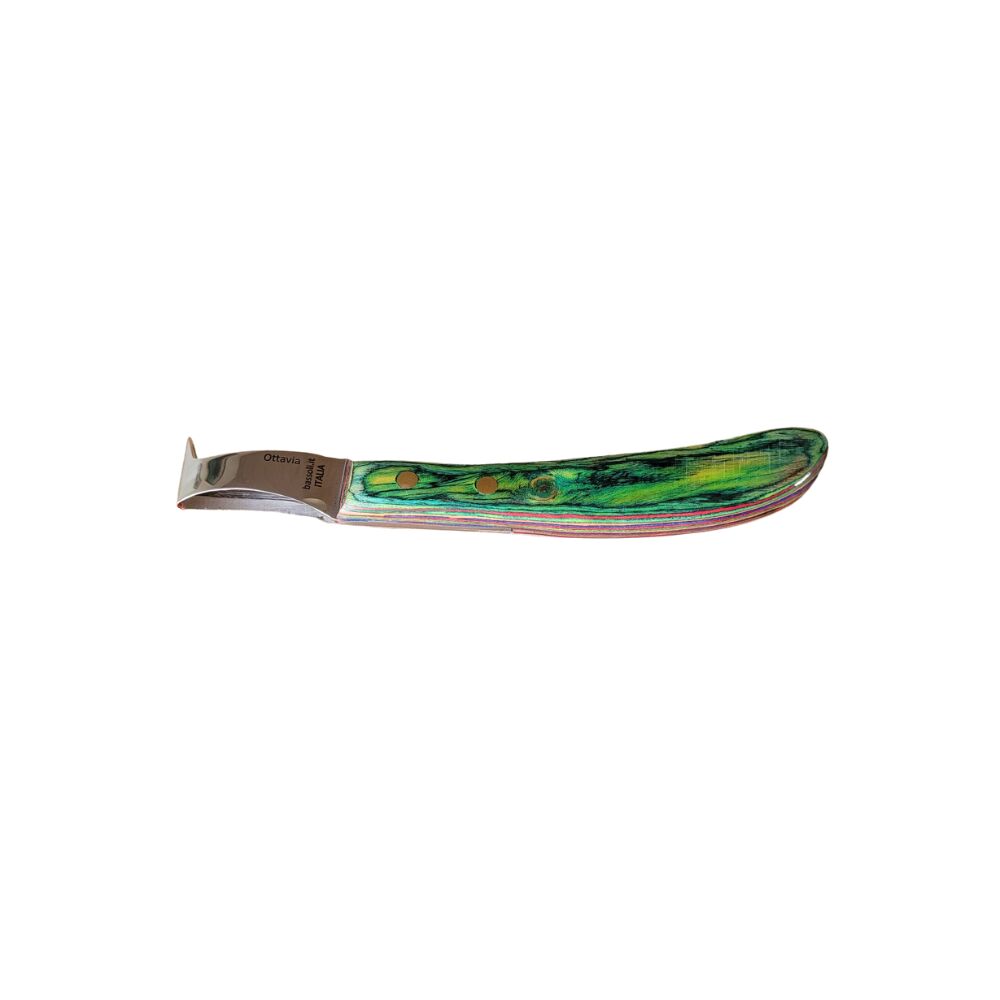 Bassoli Ottavia hovkniv med ögla Lystring kvalitetsmedvetna hästägare! Den italienska hovkniven Ottavia från Bassoli imponerar med sitt högkvalitativa utförande i fint verktygsstål. Det vassa bladet och hovskrapan lämnar inget övrigt att önska och det ergonomiska trähandtaget garanterar bekväm hantering. Bassoli Ottavia loopkniv är ett måste för hovvård!