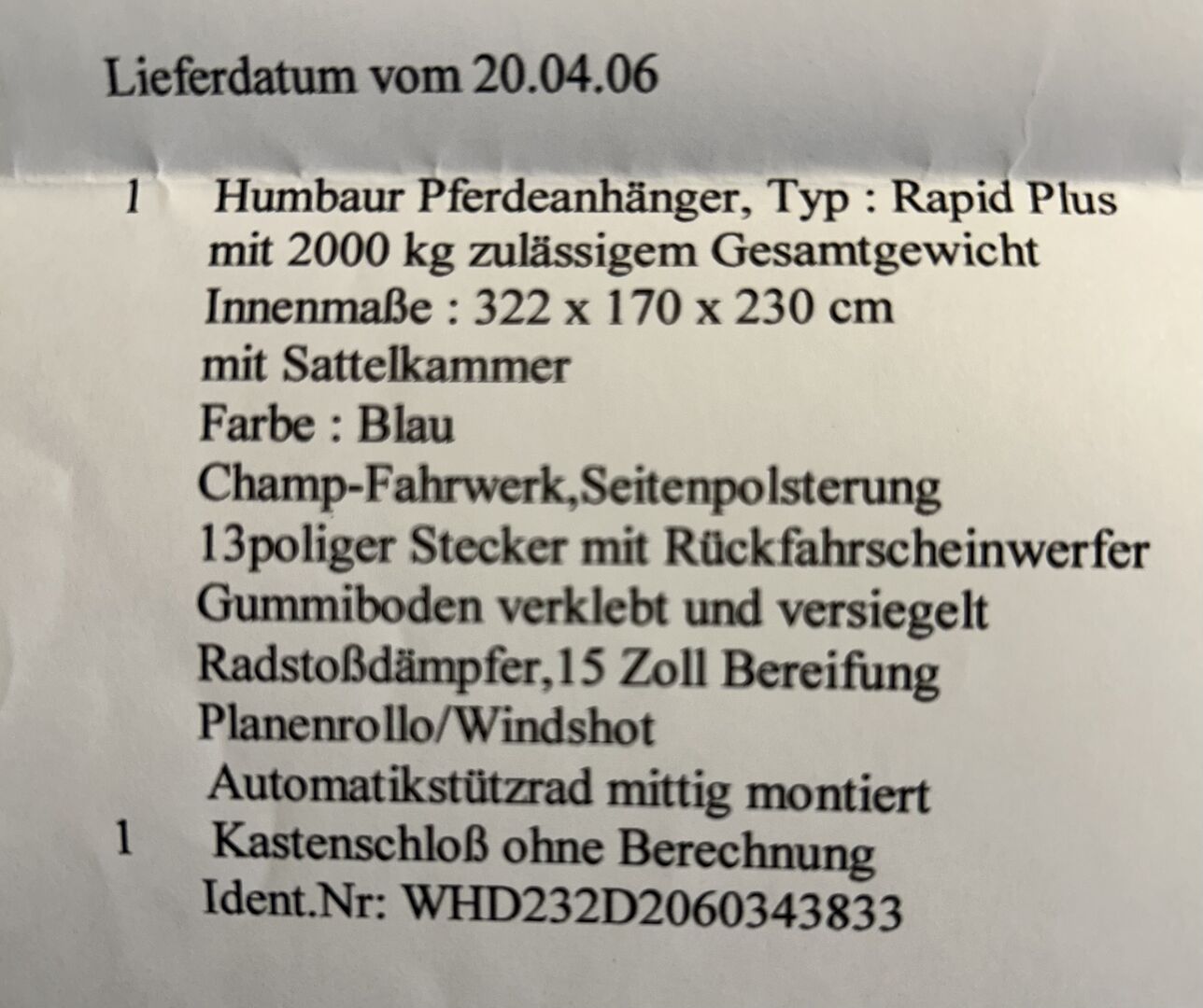 Humbaur Rapid Plus hästsläp - Släpvagnen har använts lite och säljs därför nu. Släpvagnen är för närvarande inte registrerad eftersom den behöver nya däck på grund av TÜV (för gammal). Bortsett från en rutten fläck på vänster sida framtill, normala till få tecken på användning.