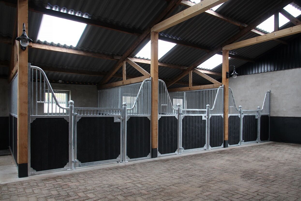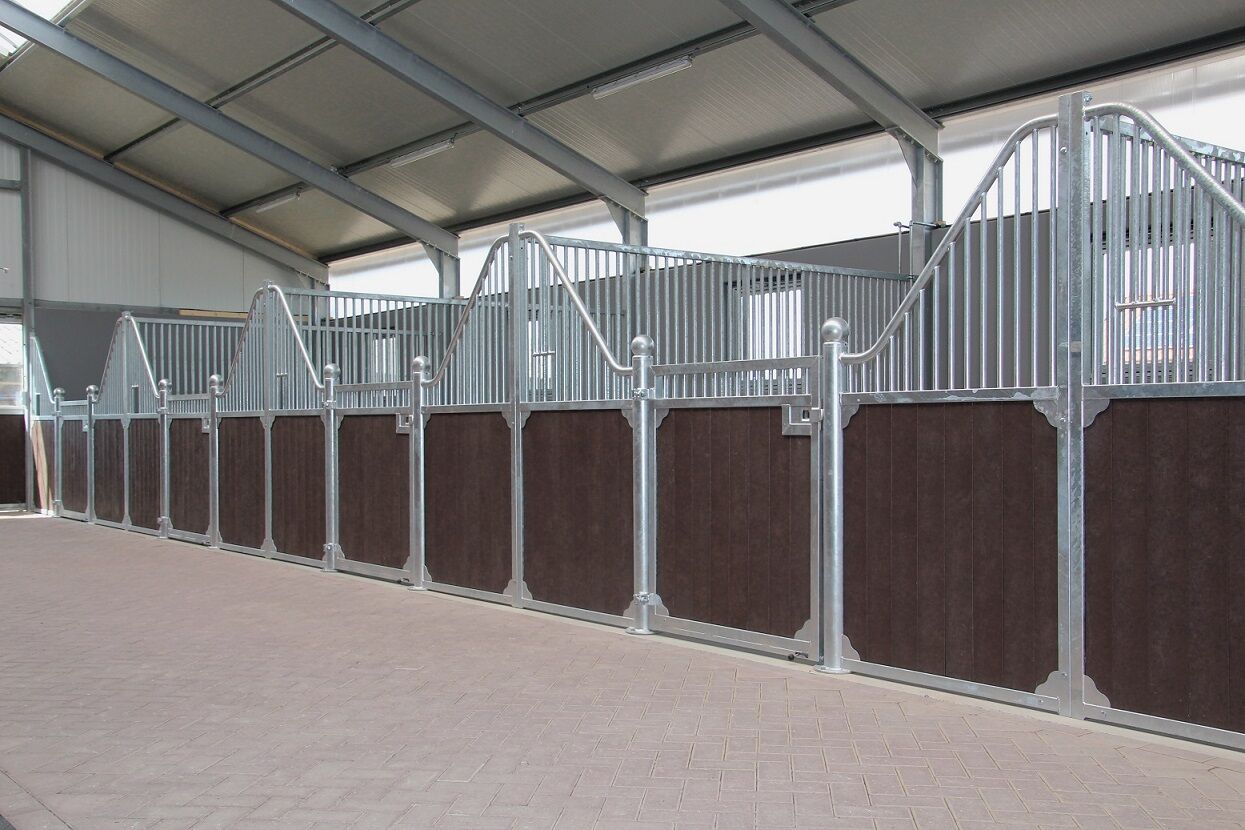 Specifikation Box Pferd Vägghöjd: 2200 mm | Dörrhöjd: 1400 mm Stödprofil: 50 x 50 mm | med stark C-profil! Stänger: Ø 22 mm | fritt utrymme på 52 mm Runda kanaler: Ø 108 mm Varmförzinkad (NEN-EN-ISO 1461)