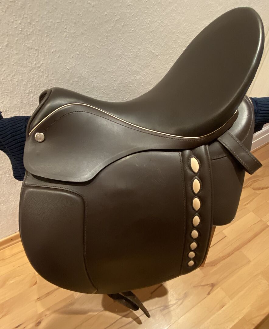 Ibero Saddle Sevilla - Jag säljer min Ibero-sadel Sevilla, eftersom jag och sadeln tyvärr inte passar ihop trots allt. Den har en sadelstorlek på 18. Jag köpte sadeln den 29.8.22. Den är fortfarande under garanti från återförsäljaren. Den har därför fortfarande garanti från återförsäljaren. Den har också ett sadelcertifikat. Den stoppades om i januari. Jag har ridit den i ett halvår. Därför visar lädret första tecken på användning. Den är utrustad med små kardborreband.