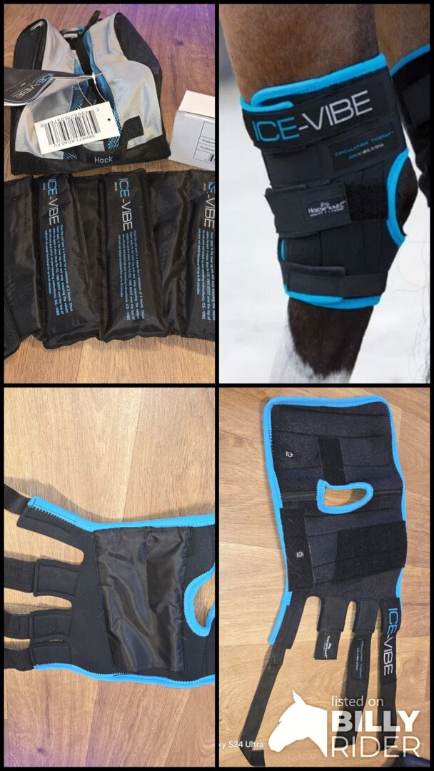 Ice-Vibe Hock Wrap-gamaschen från Horseware är speciellt tillverkade för hasleden. De används för behandling, förebyggande och eller läkning. Ice-Vibe-gamaskerna är en kombination av kylning och massageterapi för att behandla senskador. Stövlarna kan användas med eller utan kylklampar för att minska svullnad och stimulera blodcirkulationen. För att öka blodcirkulationen till senorna kan damaskerna stimuleras med de vibrerande elementen före rörelse. Detta gör senorna mer elastiska och minskar risken för skador. Enbart kylning minskar å andra sidan blodcirkulationen för att förhindra svullnad. Massageeffekten avlägsnar lymfvätskor och inflammation och stimulerar läkning av den skadade vävnaden. Ice-Vibe-stövlarna är också idealiska för hästar som vilar i boxar, eftersom vibrationerna imiterar en häst som går. Damaskerna är formade efter hasens form och ger på så sätt optimal rörelsefrihet. Kylpaketen fästs på utsidan. Det extra långa kardborreknäppningen ger en säker passform.