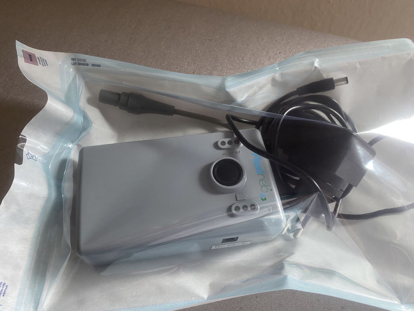 Inga defekter , Bruksspår på dimkammaren , Nebulisator 2A/E3 fast 2st som ny , Utloppsventil ny , Inloppsventil ny , Förlängningsenhet 20ml , Hållrem aerosolkammare , Hållrem med klämlås , Hållremmar för hållringar , 1L saltlösning 1% .