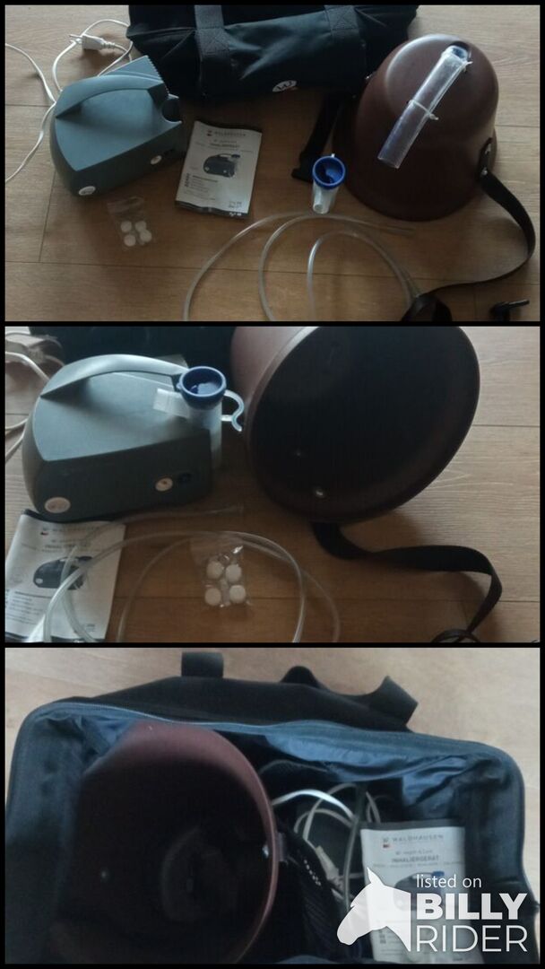 Inhalator för de övre och nedre luftvägarna och för inandning av läkemedelsaerosoler djupt ner i luftvägarna. Hästvänlig och mycket effektiv. Innehåller Inhalationsmask/uppsamlingsbehållare, nebulisator och praktisk förvaringsväska. Inhalatorn är rengjord och desinficerad och fullt funktionsduglig.