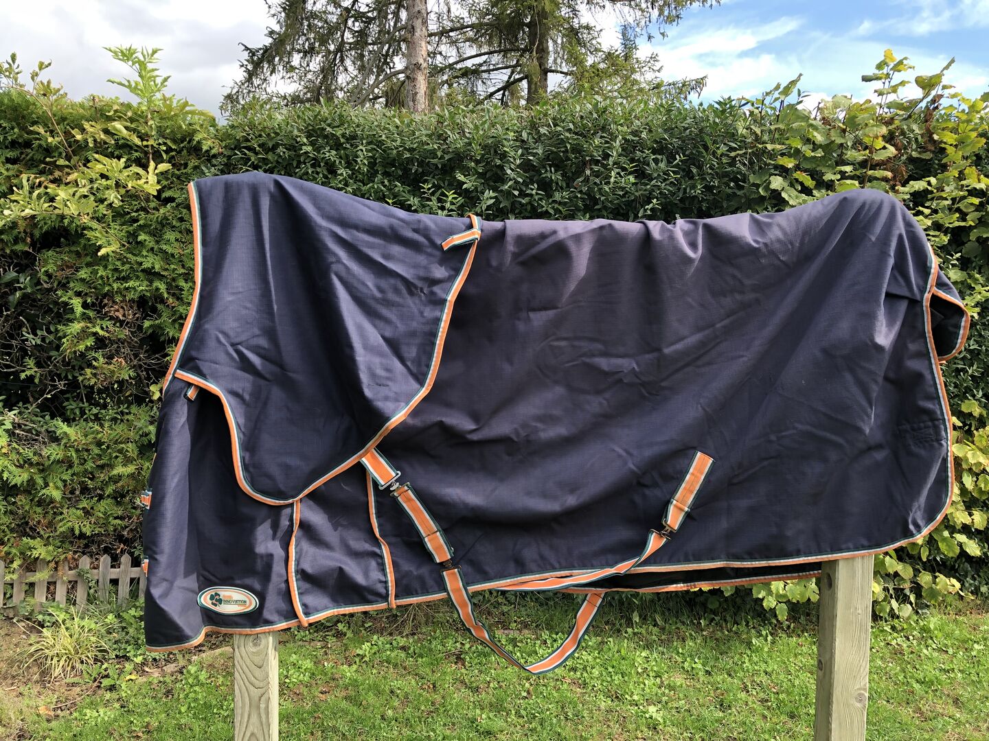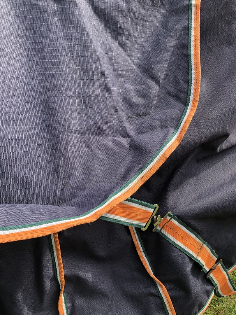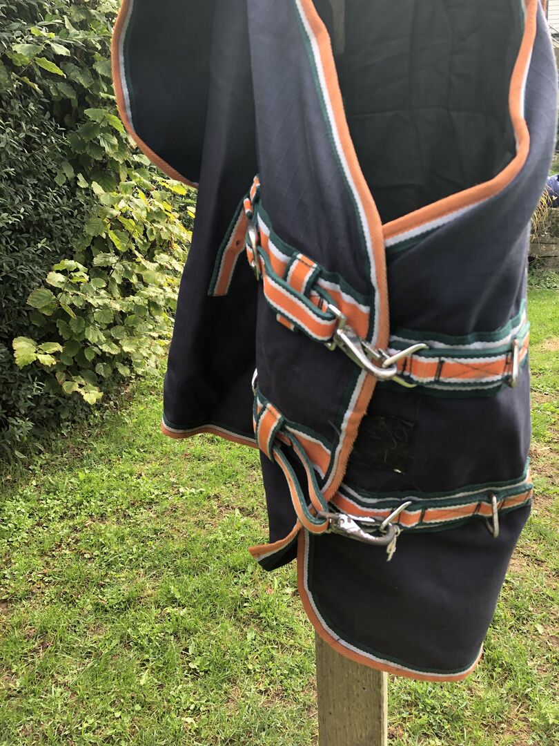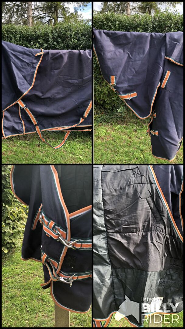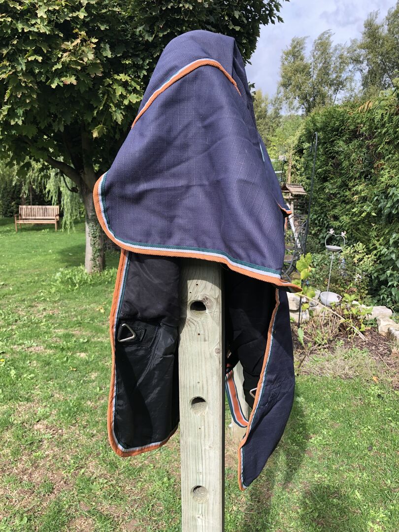 Irish Innovation Paddock Blanket, 300g, 155cm - Jag säljer denna nyss rengjorda och impregnerade filt. Halsstycket är fäst på filten, men kan fästas på filten när det inte används så att det inte glider. Det finns också två öglor i slutet av halsstycket för att fästa det på ett halster om det behövs. Bra skick, endast lite rost på spännena. Fodret är slätt. 1200 denier.