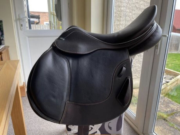 Dark brown moon flap jump/event saddle, W fitting Excellent condition with long straps and cones with mark Todd stud girth Super comfy and soft Sadly lost horse so no longer needed