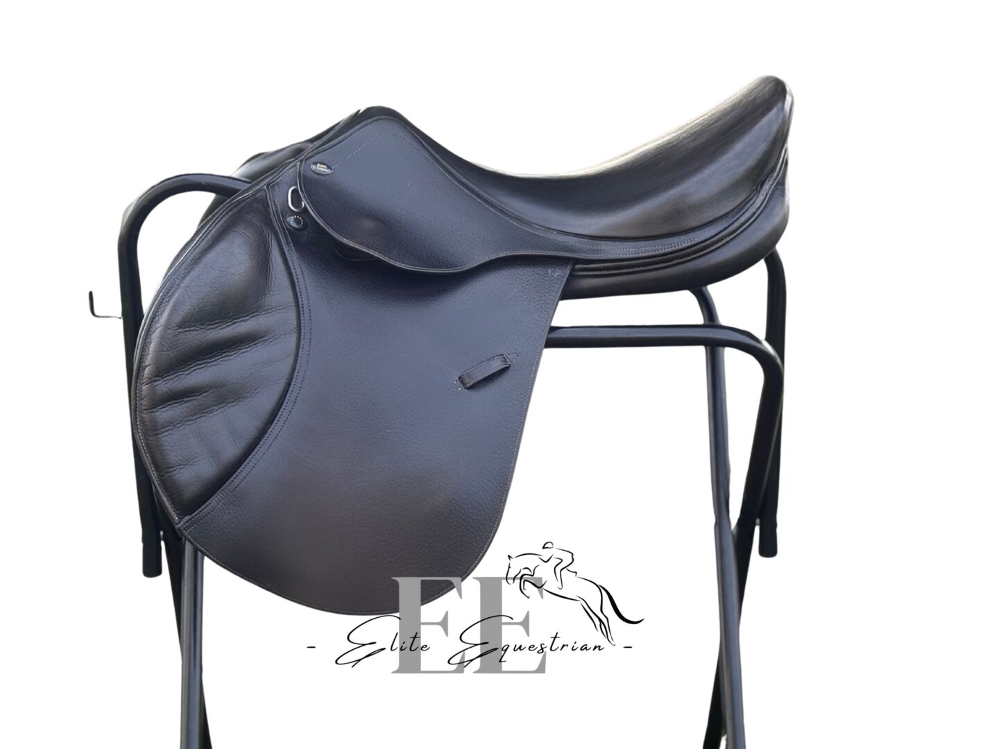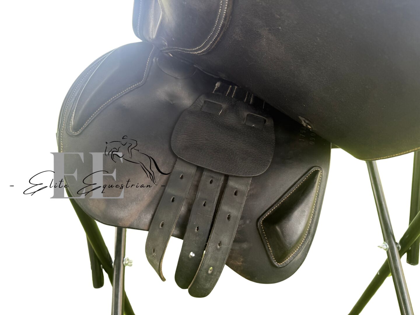 John Whitaker Springsattel 17,5" - Till salu är en högkvalitativ, engelsktillverkad John Whitaker hoppsadel. Denna premiumsadel bär namnet på den världsberömda brittiska hoppryttaren John Whitaker, som själv var aktivt involverad i utvecklingen av dessa sadlar. Whitaker-sadlar är tillverkade av läder av högsta kvalitet, vilket inte bara ger dem ett elegant utseende utan också garanterar en lång livslängd. Sätet är skuret medellågt, så att det ger ryttaren tillräckligt med rörelsefrihet. De förformade sadelklaffarna och de medelstora knä- och vadblocken ger stöd för en korrekt benställning.
