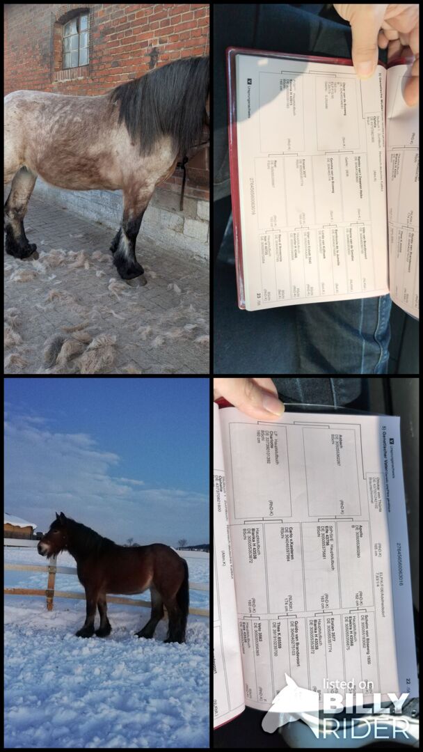 Kallblod rhensk tyska - Vänligen endast seriösa förfrågningar som är medvetna om storleken / vikten och kraften hos ett kallblod! Vi säljer vårt rhensk-tyska kallblodssto 1,62 . Hon kommer att vara 9 i år . ca 680 kg uppmätt i februari . Papper och hästpass tillgängligt . Stamtavla : se sista bilden Pappa : Ottokar von Thüritz Mamma : Ophellia Färgskiftning : På sommaren ljus , på vintern brun under tiden nästan vit . Hon är medium i rankningen. Hon står för närvarande i ett öppet stall (får en bra päls), har också stått i en låda, allt utan problem. Hon är inriden och kan Western och engelsk sadel (du kan rida henne i skritt, trav och galopp (galopp fungerar men hon saknar bara kondition och ytterligare övning). Hon säljs som ej riden eftersom hon inte sitter än! Men hon gillar inte att rida så mycket heller, kanske skulle körning vara mer lämpligt för henne. Men hon har inte blivit inkörd än, hittills har vi bara tagit henne runt arenan och hallen och dragit släden. Det har hon klarat bra. Hon tycker också om friarbete och cirkuslektioner, men longering är inte hennes grej. Hon gillar att göra något för huvudet. Hon håller på med pole work men att lyfta fötterna är en av de sakerna. Men hon gillar att hoppa fritt, naturligtvis på lägsta nivå. Hon vill ha någons uppmärksamhet annars är hon inte med på noterna eller gör sin grej. Hon har haft hårväxt sedan hon var liten som jag ännu inte har lyckats bli av med. Hon är regelbundet maskad och naturligtvis vaccinerad, tandläkare (tänderna kommer att kontrolleras och göras igen i slutet av april) och hovslagare vet hon naturligtvis (för närvarande på Duplos eftersom hon står på kullerstenar annars barhoof). Hon har bara släpats 3 gånger hittills men det gick bra.