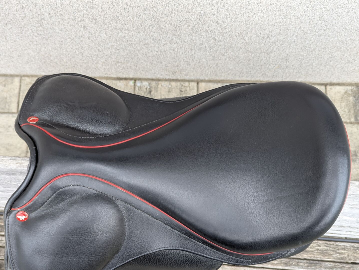 Gaffelbandsplatta röd medium. Sittyta 17 tum Ullfyllning, så att sadeln kan anpassas till hästen och vadderas vid behov (vilket inte är fallet med latex) Mjukt säte med medium knäveck. 2,5 år gammal med måttlig användning.