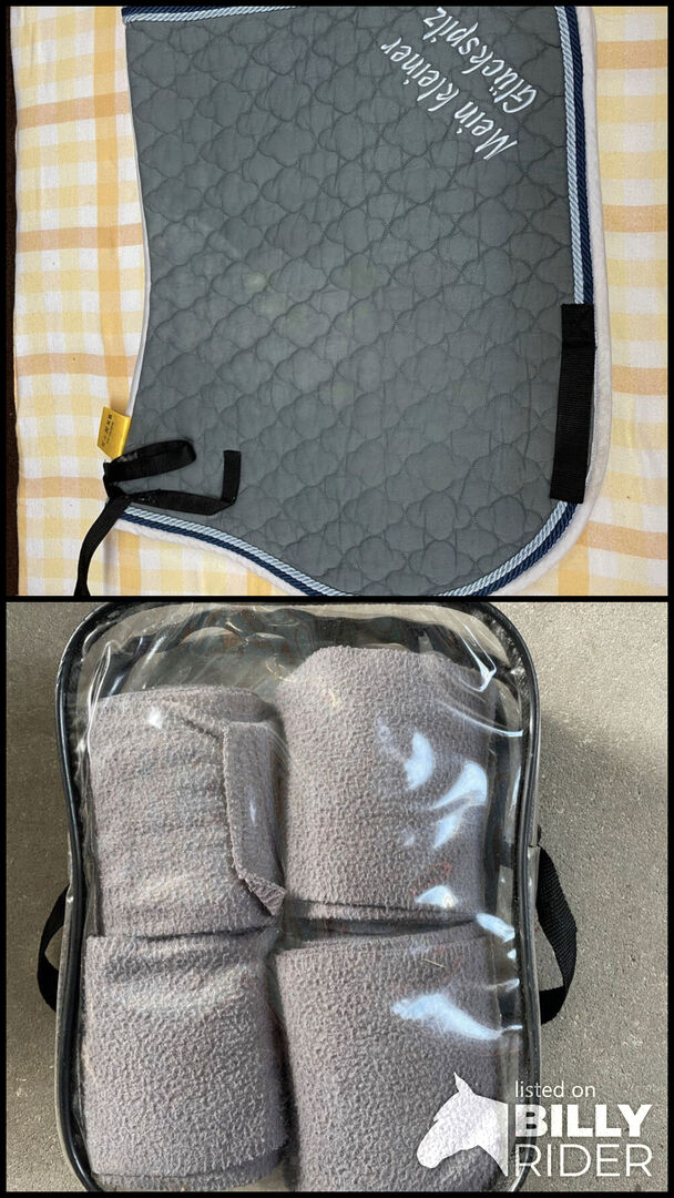 Kavalkade Sadelunderlag & BR Bandage WB för fälttävlan - Eftersom jag har slutat rida säljer jag mitt gråa fälttävlansschabrak från Kavalkade med broderi "Mein kleiner Glückspilz". Det har använts mycket lite och har bara några få spår av användning. Jag ger också fyra BR-bandage i storlek WB som ett set.