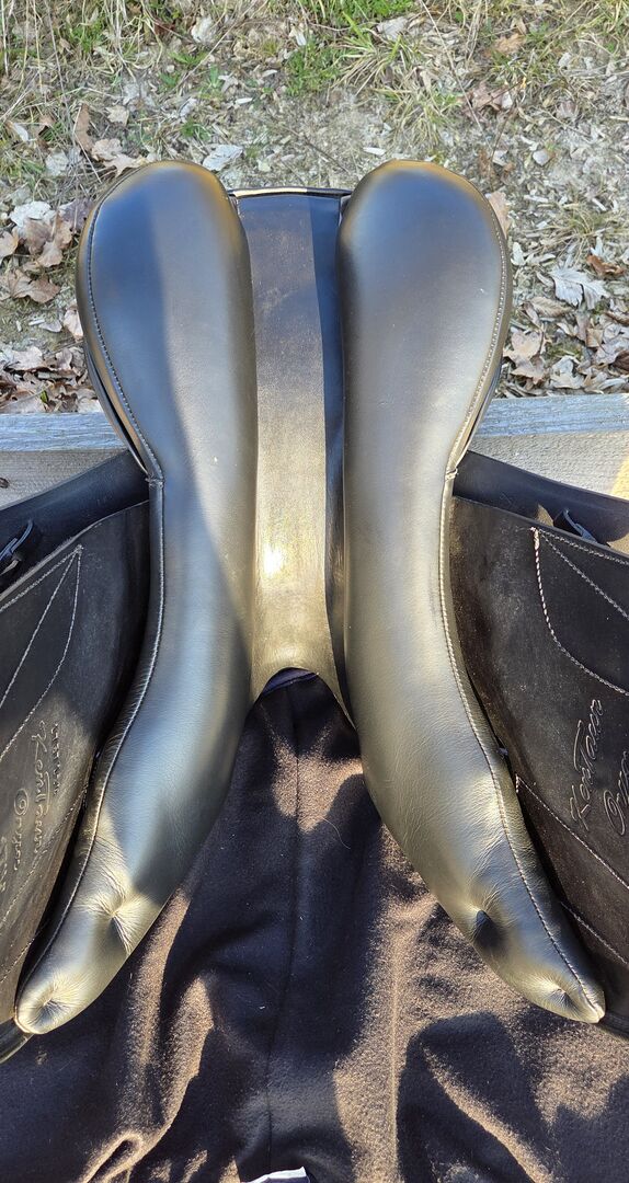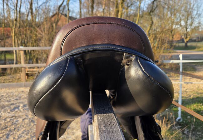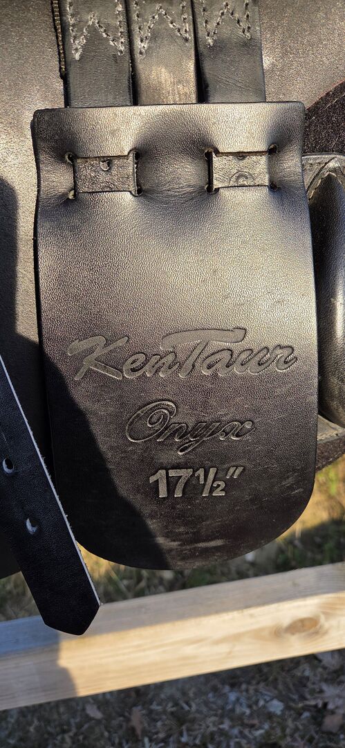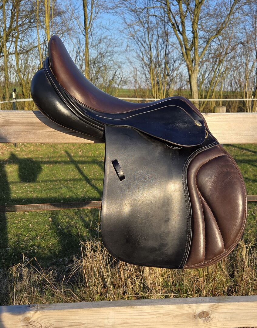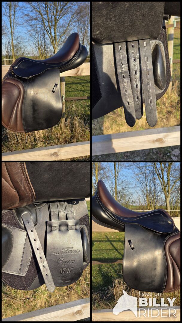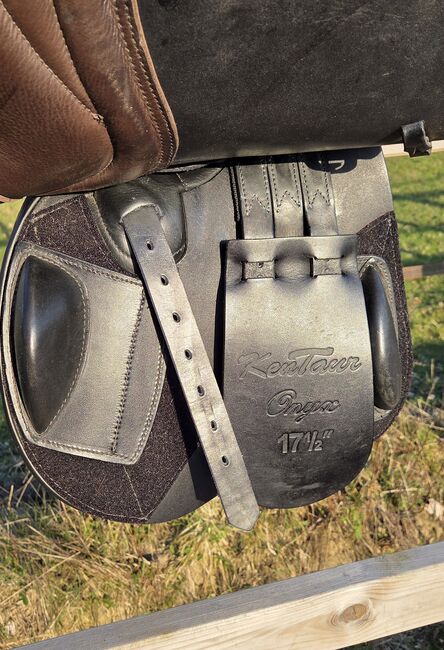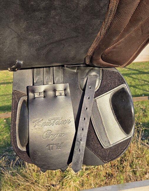 Kentaur Onyx hoppsadel 17,5" - toppskick, svartbrun - Jag säljer min Kentaur Onyx hoppsadel i storlek 17,5", färg svart-brun. Sadeln har endast använts som en andra sadel och har varit i min ägo i 3 år. Den visar minimala, normala tecken på användning, har alltid förvarats torrt och varmt och har kontrollerats av sadelmakaren var sjätte månad och regelbundet vadderats. En extra kotlettplatta monterades senast i december 2025.