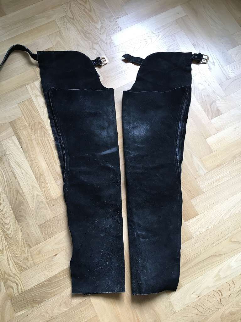 Kepsar Långkapsar Fullkapsar - Western chaps, svart mocka, lite begagnade och i bra skick, dragkedjor är tip-top, går ganska små (storlek 36?). Jag (1,71, 56 kg, storlek 38) får fortfarande plats, men de är lite för tajta för mig.