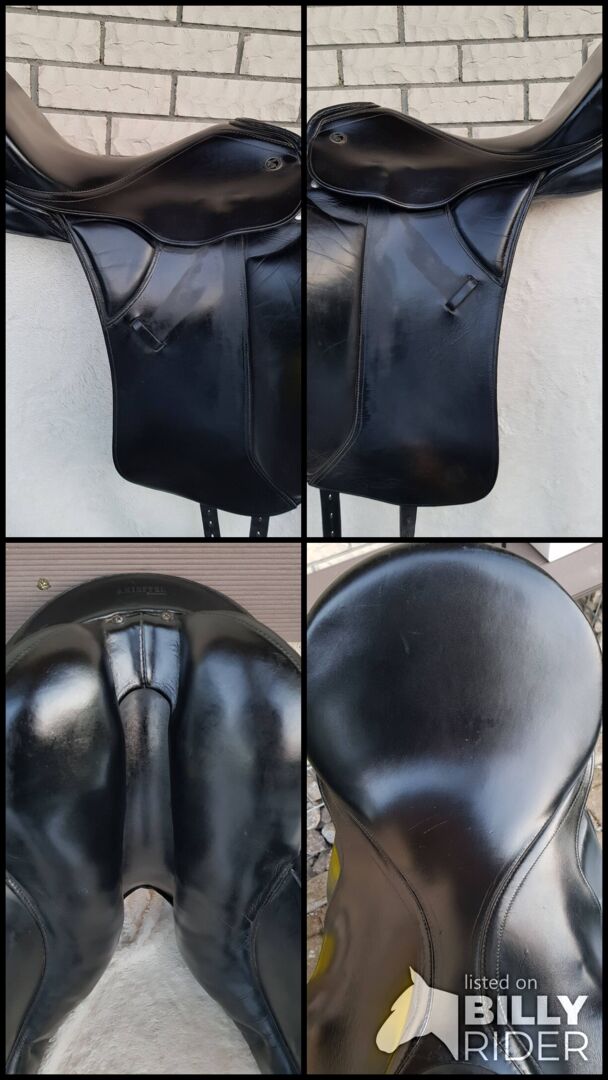 Kieffer dressyrsadel "Lusitano" extra djup - Jag erbjuder dig min Kieffer-dressyrsadel "Lusitano". Med extra djup sits. Mycket bekväm, du sitter verkligen i eller mycket nära hästen. Storlek på sätet 1. Medelstor kammare. Kan ändras av sadelmakaren. Det är en äldre modell, men den har alltid varit välskött och aldrig använts permanent. Den har varit täckt i kammaren under lång tid, eftersom jag äger andra sadlar och på något sätt aldrig känt för att fotografera den. Jag lät en sadelmakare kontrollera och värdera den. Naturligtvis har den spår av användning, men dessa är helt normala för en begagnad sadel. Den användes på ett 165 cm långt warmblood med mycket vrist och en terminal ponny, eftersom den är fin och kort.